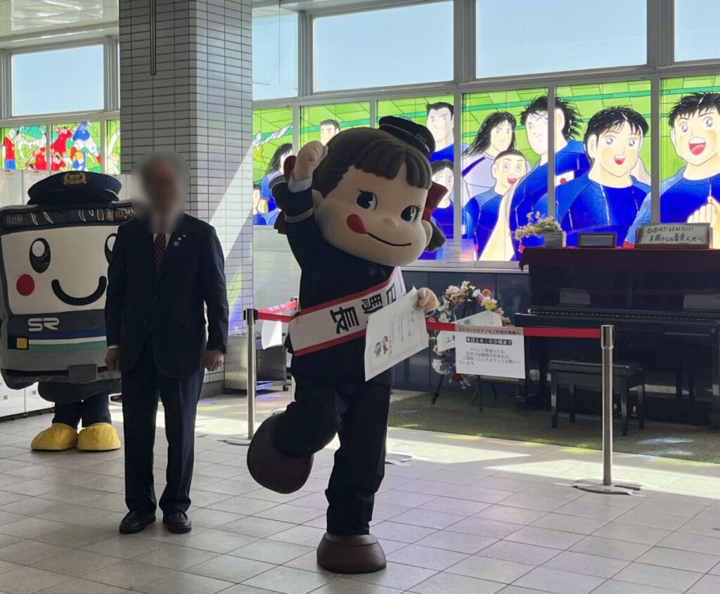 浦和美園駅に「ペコちゃん」が登場!1日駅長に就任したみたい。