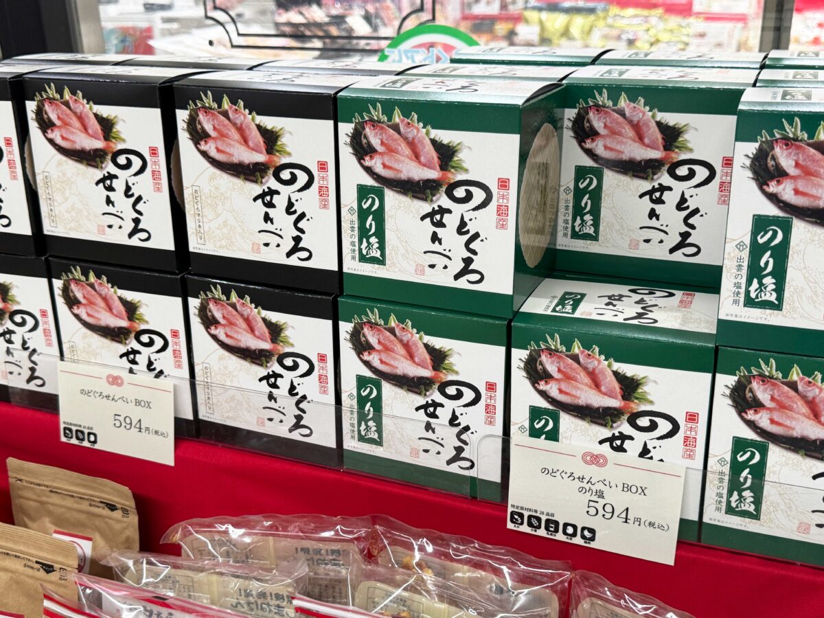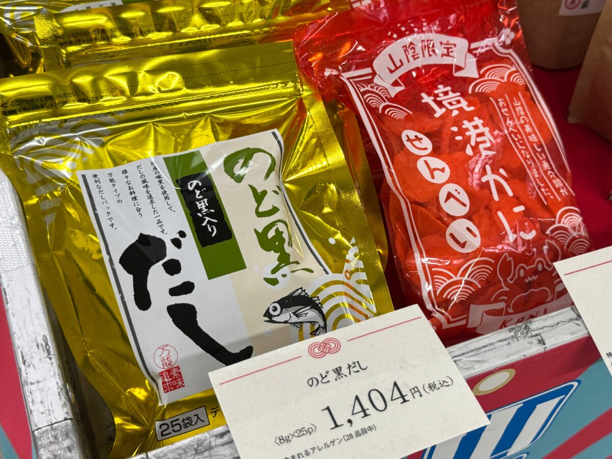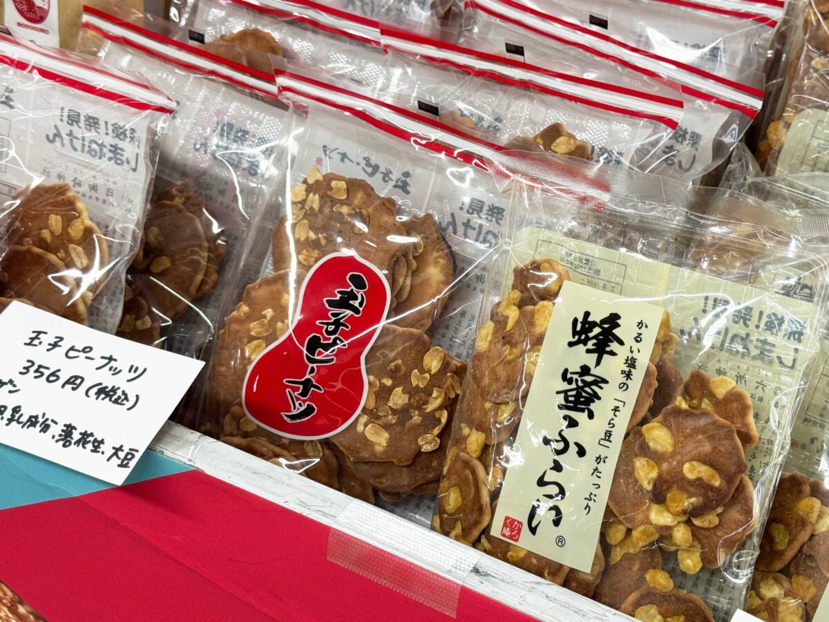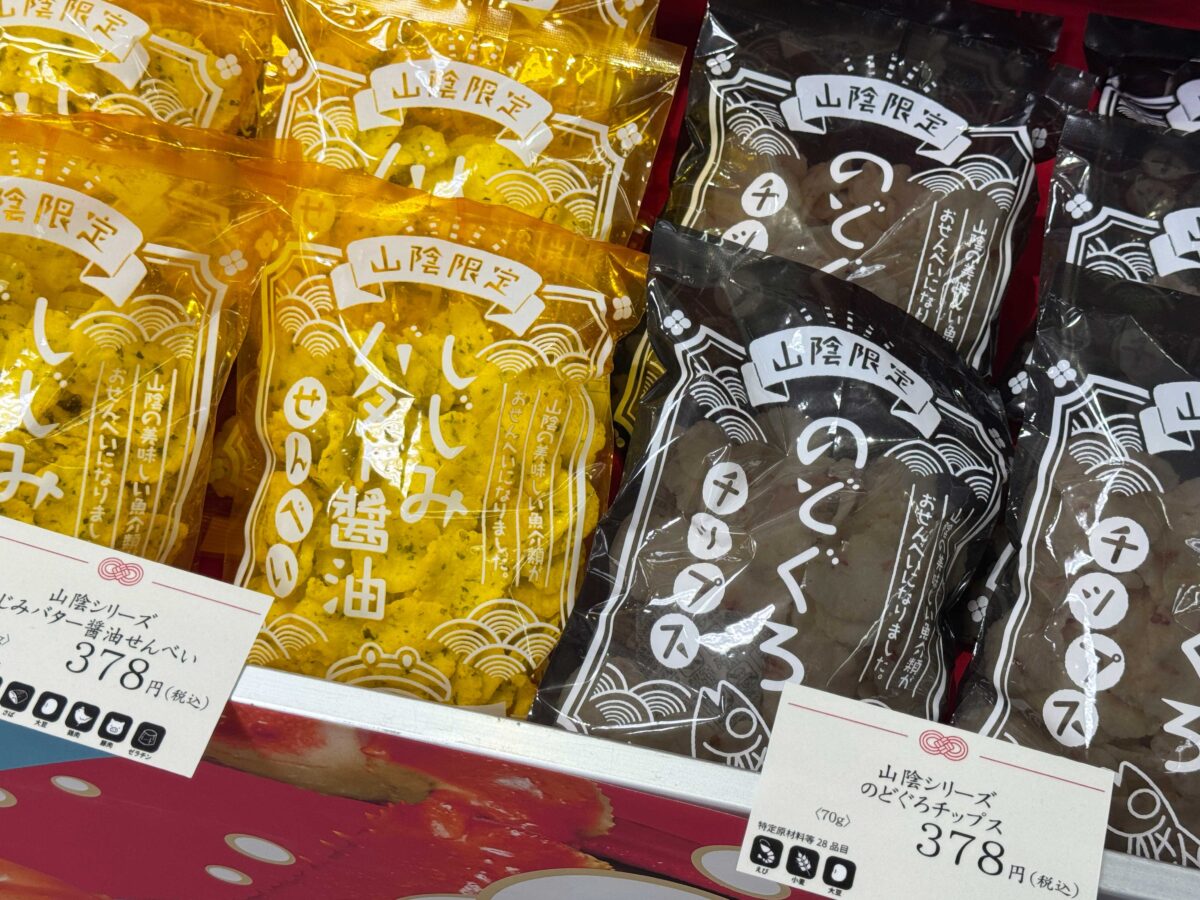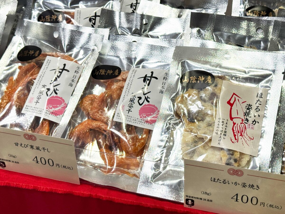壁際のほうから見ていくと、山陰で獲れた海産物を使った贅沢せんべいの数々が。手が止まらなくなりそう。