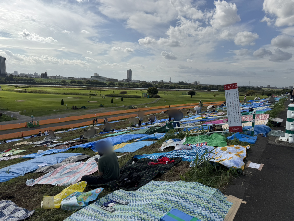 川口花火大会、無料席の13時頃の様子です。花火打ち上げ場所の近く側は埋まりだしてる。