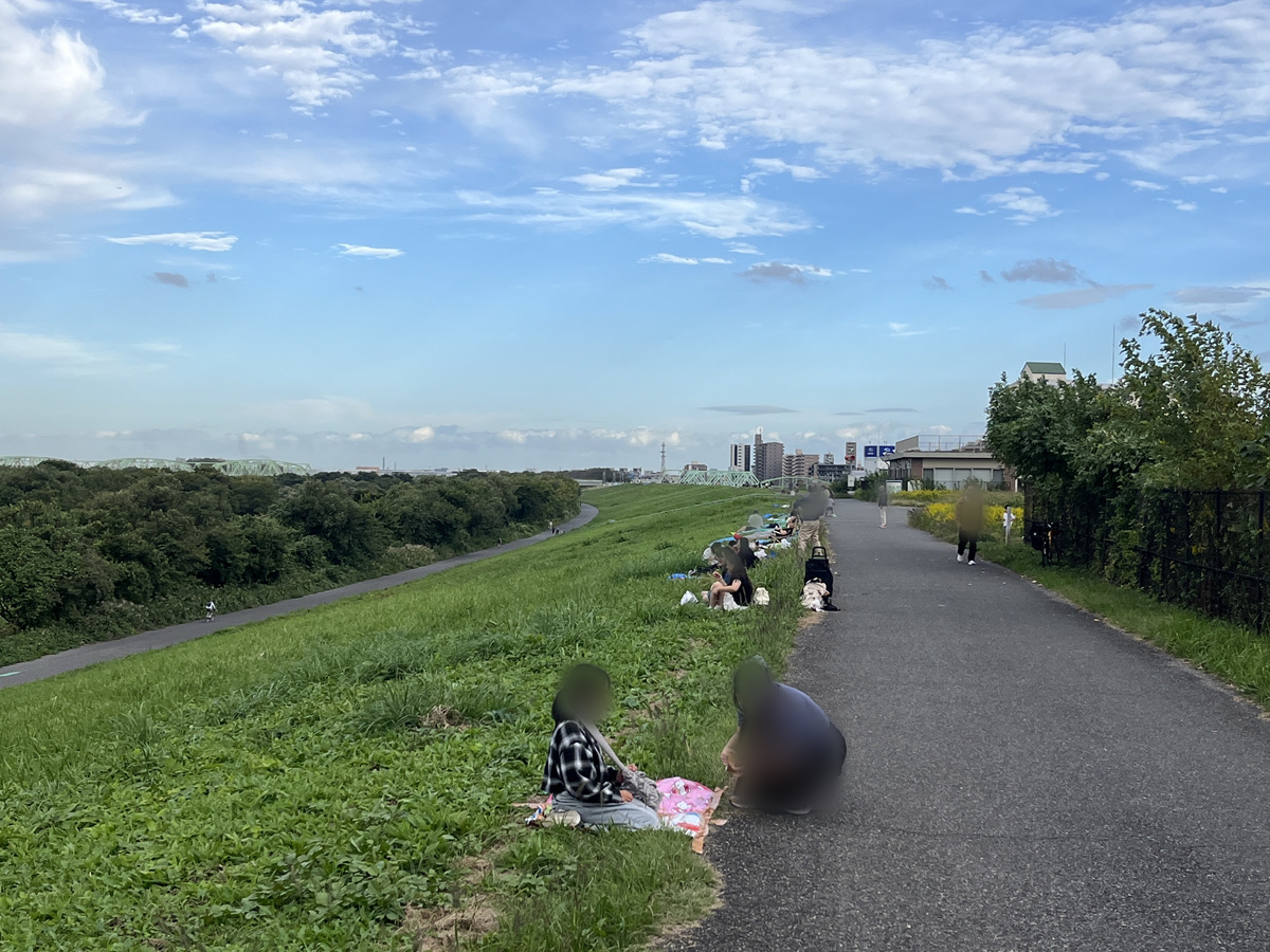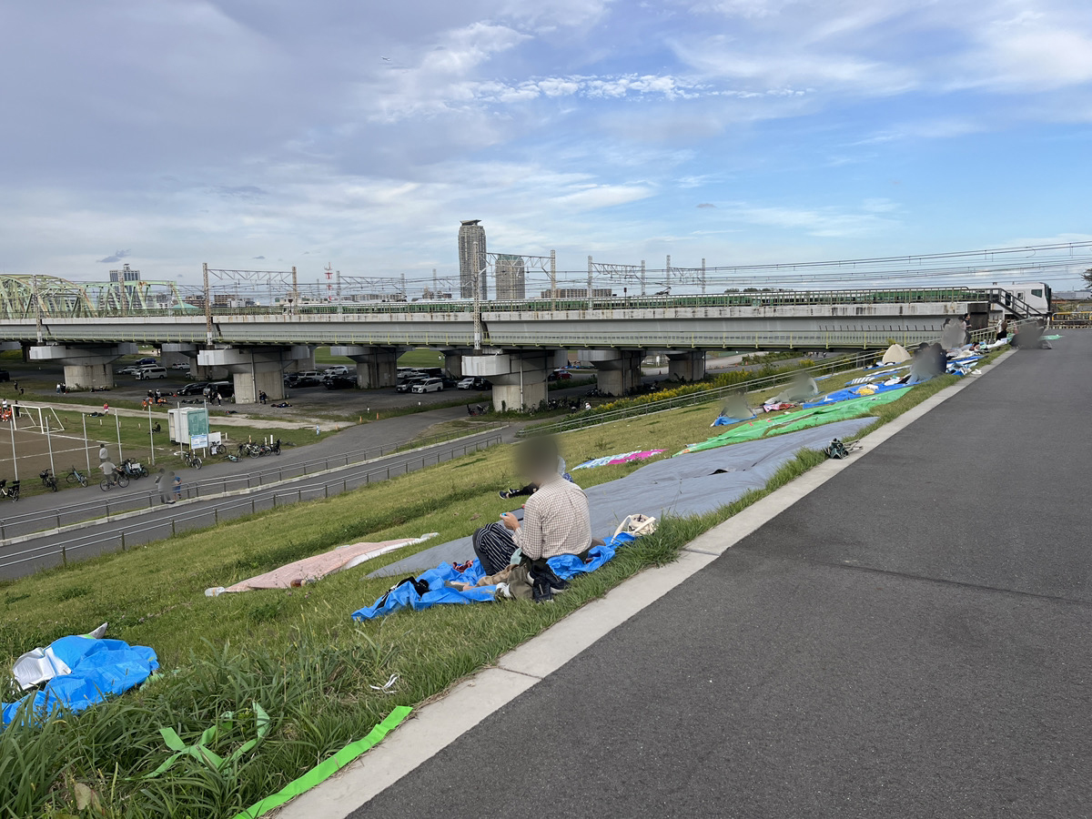 さらに浮間舟渡方面に進んだ辺りも、レジャーシートが並んでいました。でも、まだまだスペースには余裕があります。