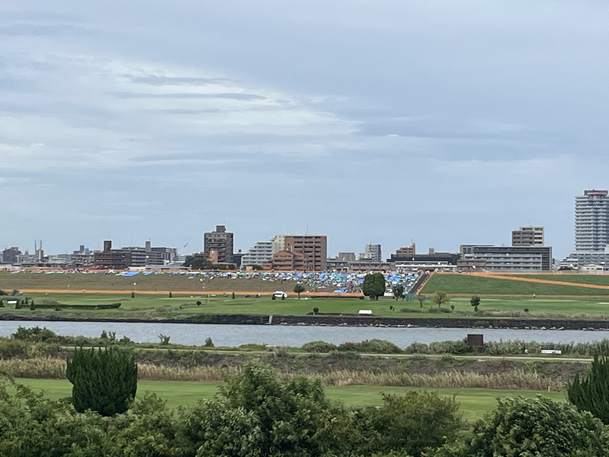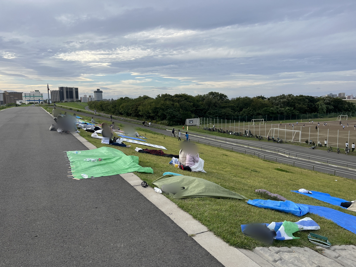 川口花火大会、無料席の13時頃の様子です。花火打ち上げ場所の近く側は埋まりだしてる。