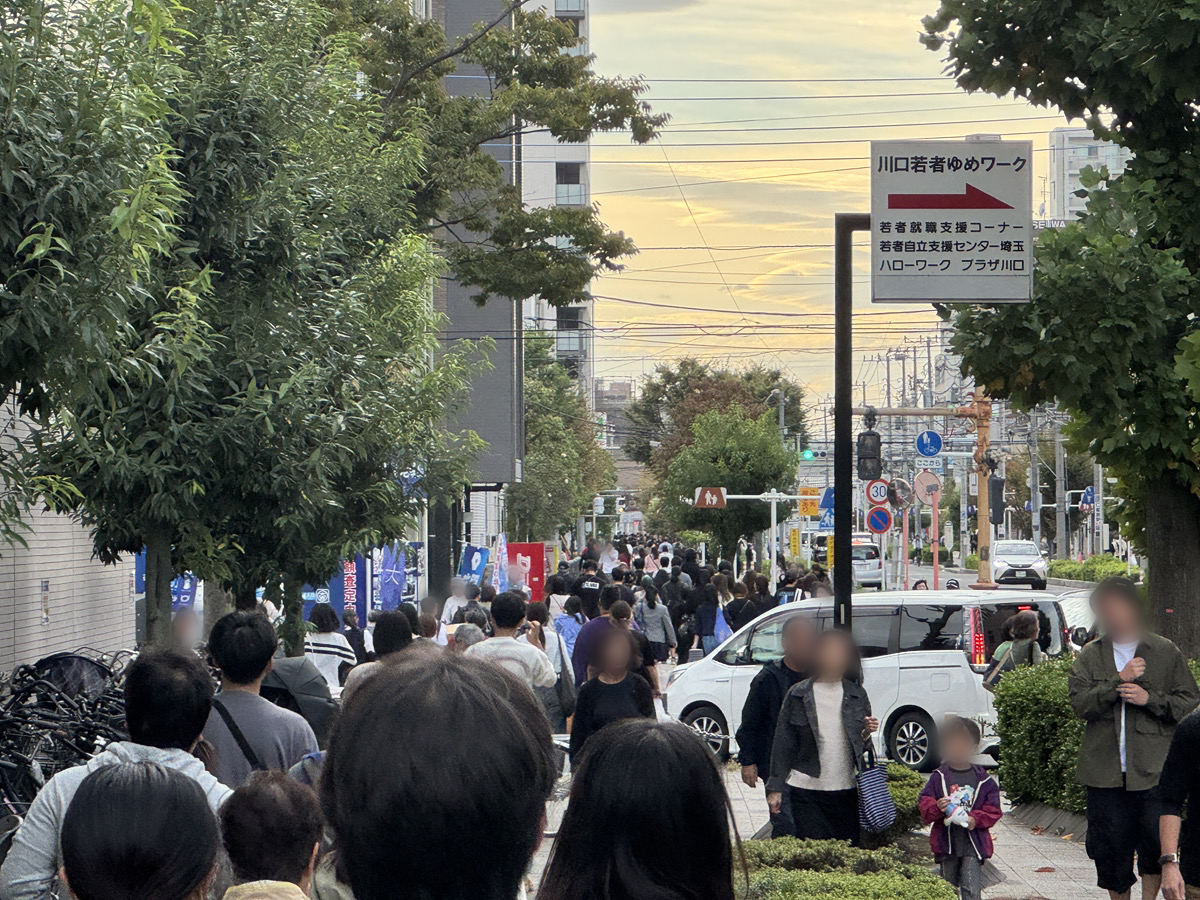 川口駅西口から花火会場へ向かう道中の様子。キッチンカーすんごい行列できてる。17時15分前後。