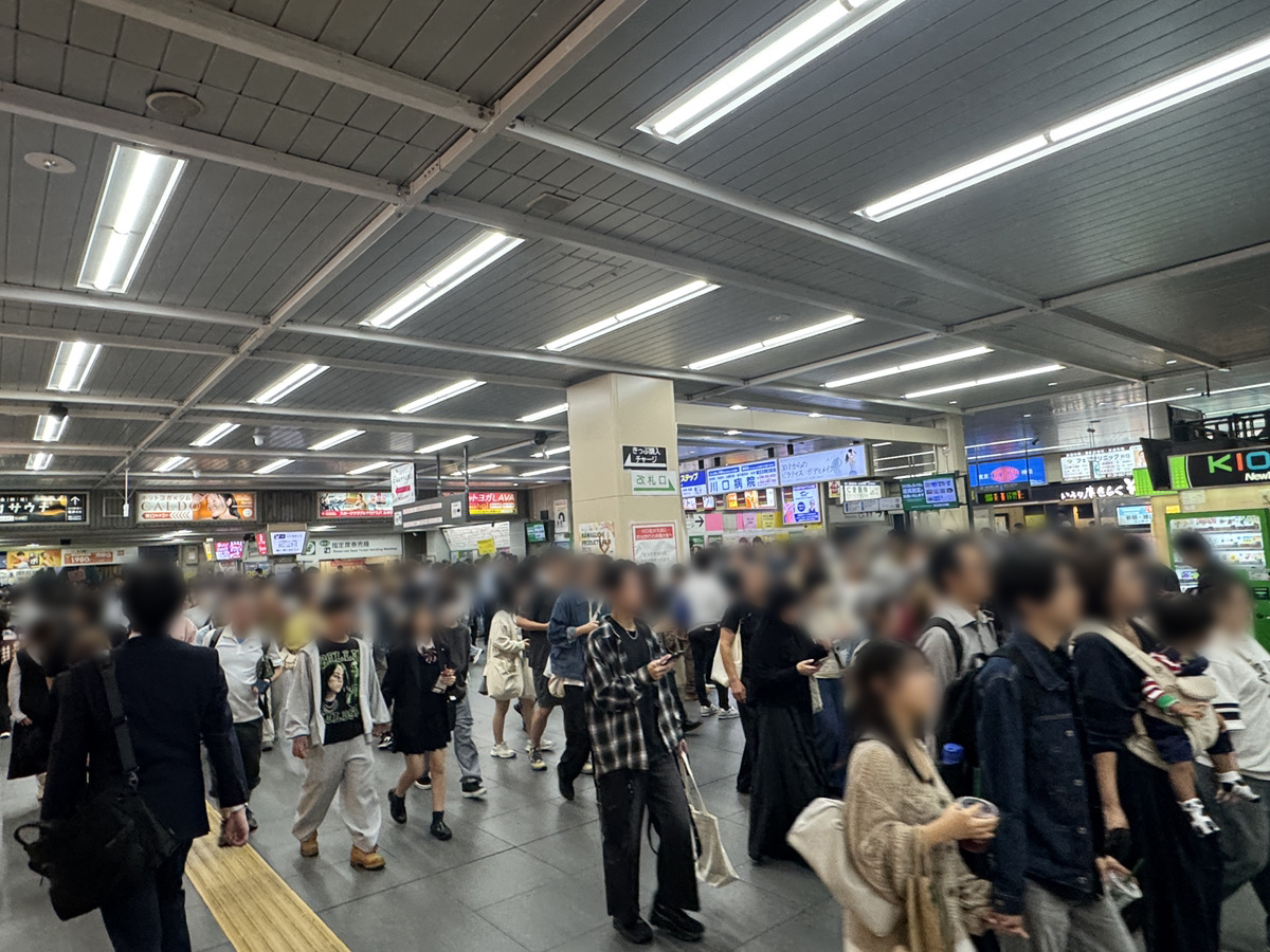 川口花火大会のあとの川口駅19時30分ごろの様子。人の量は多いもの、ある程度人との間隔が保てています。