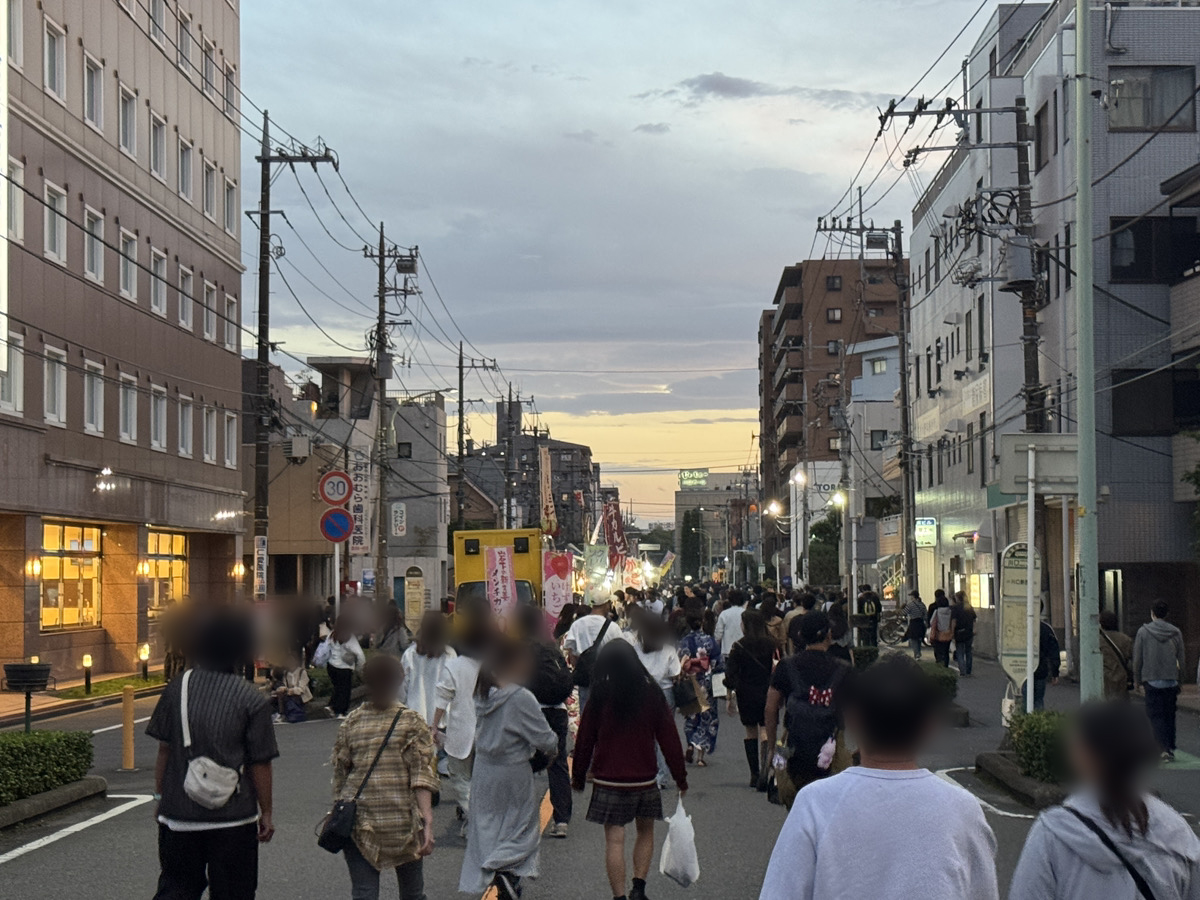 環状線通り、川口花火会場に向かう人が続々と。露店店もめちゃくちゃ人だかり。