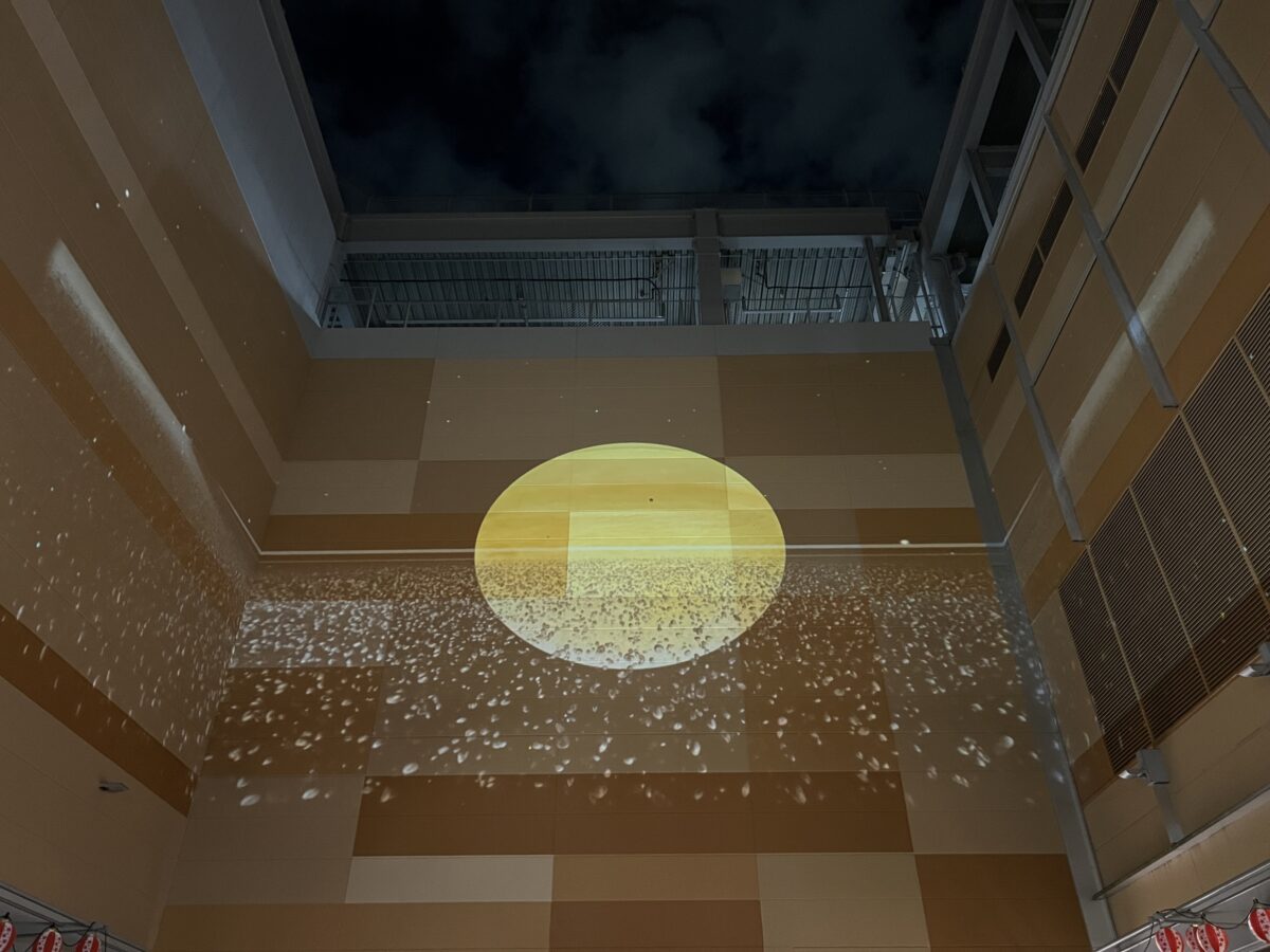 「いつもの中庭でプロジェクションマッピング!?光と音の世界をお楽しみください。」とでてますよ。