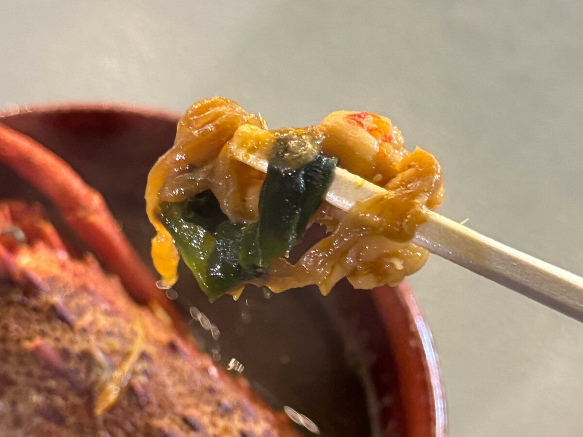 鍋の中にも海老がちゃんと入ってた!煮込まれたネギをハフハフ。