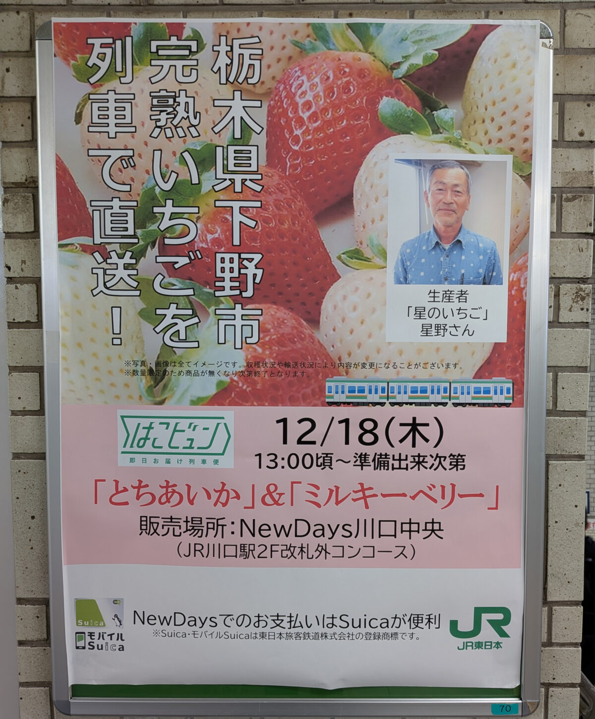 川口駅で栃木から列車で直送された「とちあいか」と「ミルキーベリー」が販売されるみたい! NewDays川口中央店にポスターが貼ってありましたよ! そのポスターがこちら...