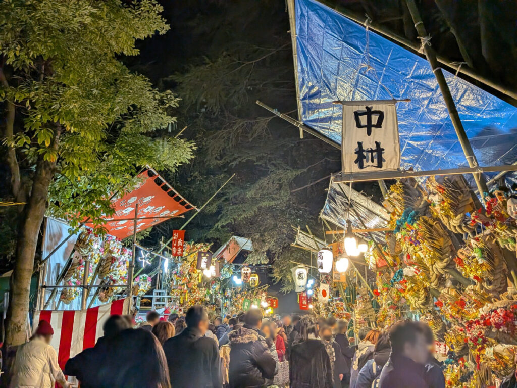 熊手がズラリと並んで、あちこちで三三七拍子!