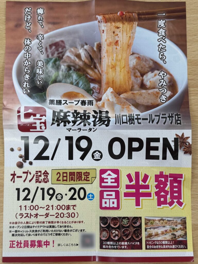 樹モールプラザ1階にできる「七宝麻辣湯(チーパオマーラータン)」ですが、12月19日(金)新オープンみたい! 店頭にお知らせが出ていましたよ! https://kawaguchi-magazi...