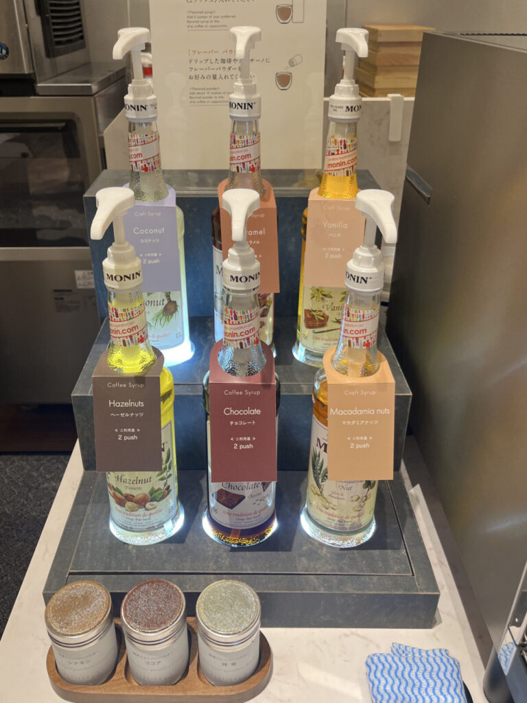 そしてコーヒーやカプチーノに追加できるフレーバーシロップなども。