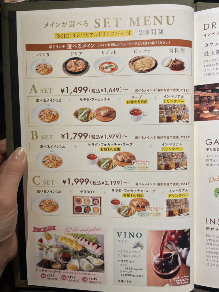 A・B・Cセットすべてに、おかわり自由なスープと先ほどのインペリアルドリンクバーがついてきます!※B・Cはサラダとフォカッチャもおかわり自由!