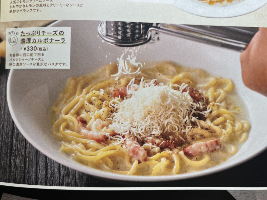 カルボナーラのチーズ、注文すると目の前で削ってくれるんですって!