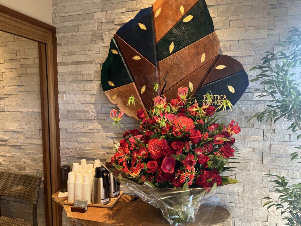 入り口のドアを開けると、ステキなアートと立派なお花がお出迎え♪