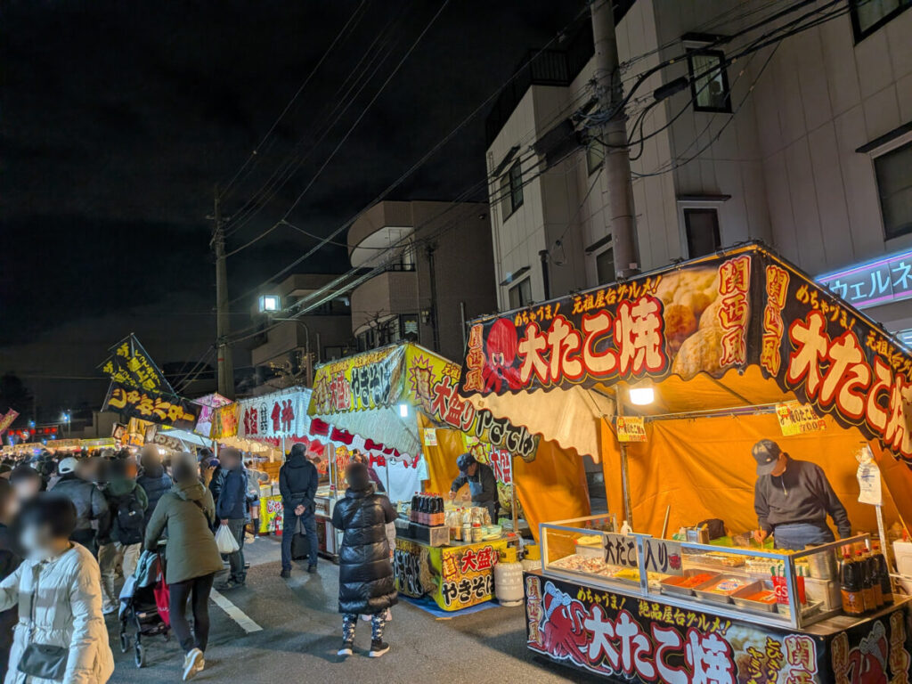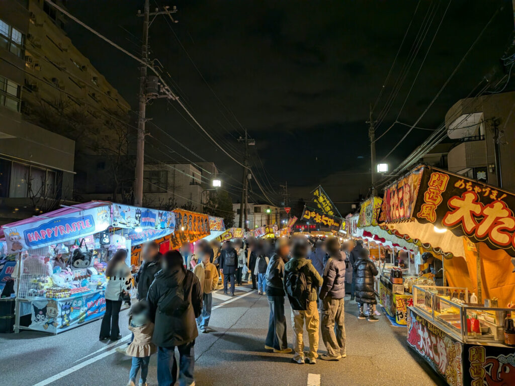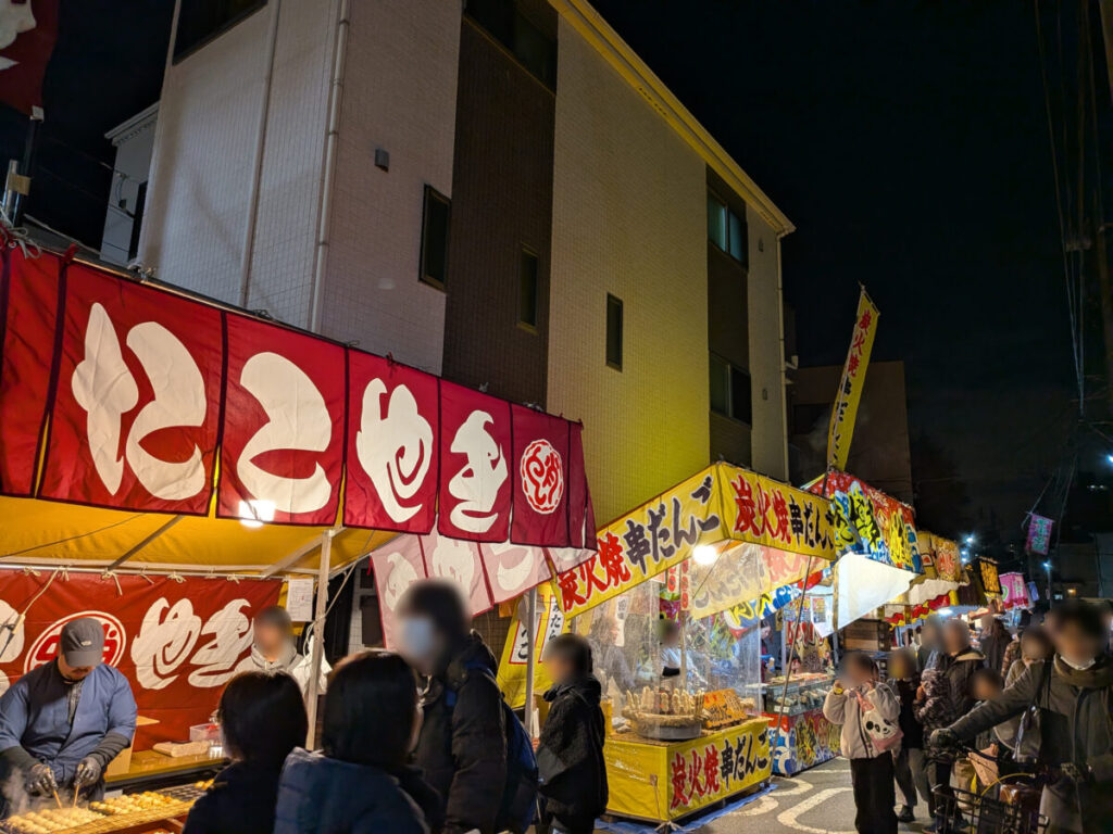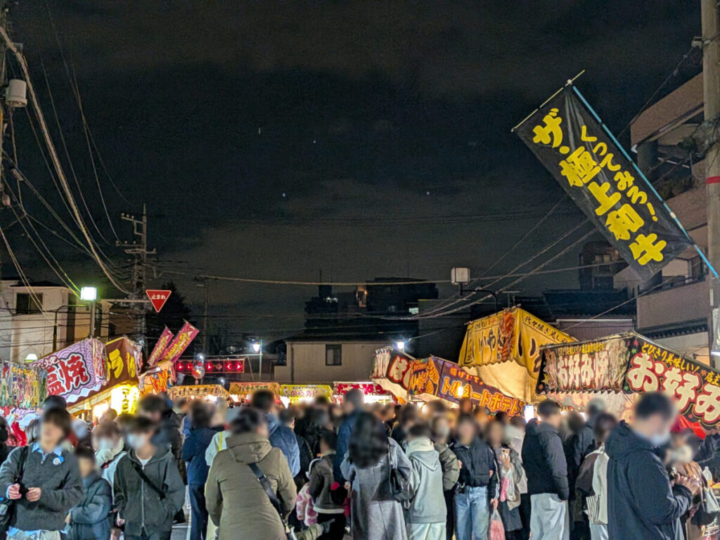 12月19日、川口駅西口の飯塚氷川神社の熊手市、19時前後の様子です。
