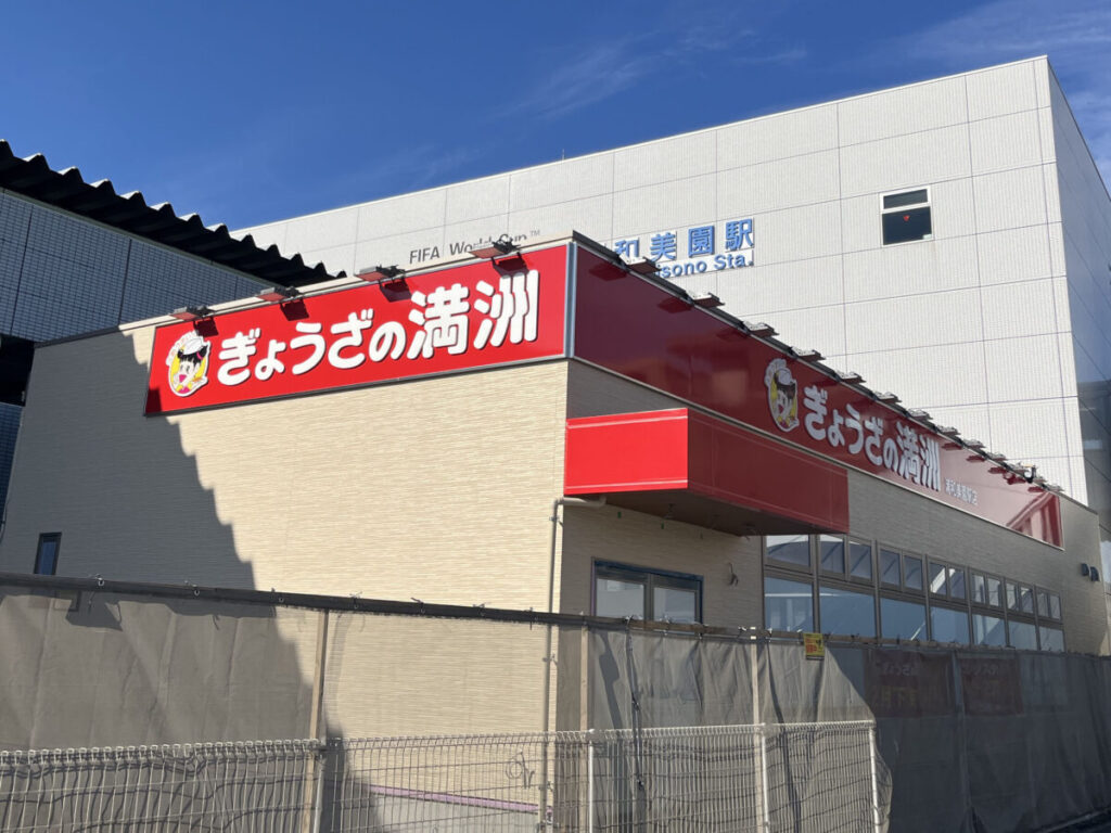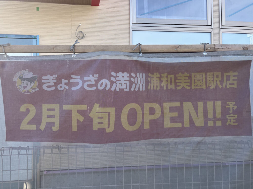 浦和美園駅の3番出口を出てすぐのところに、「ぎょうざの満州 浦和美園駅店」が2月下旬に新オープンするみたい!すでに看板ができていましたよ。
