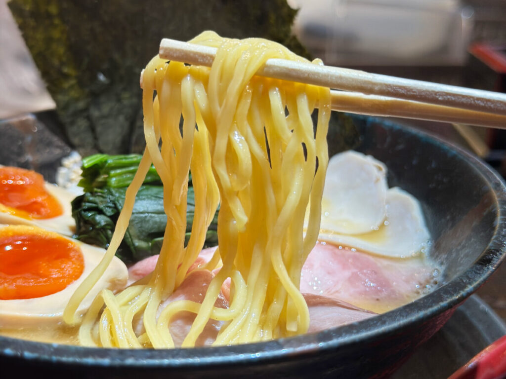 麺をズズズっと。かための仕上がりで、もっちもち。スープが絡んでいい。