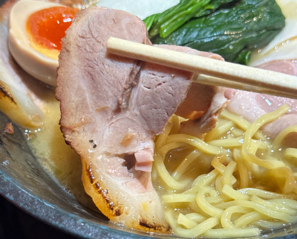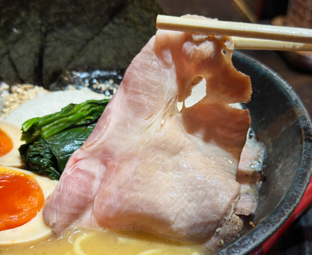特製を頼むと、チャーシューが3種類2枚ずつの計6枚の乗っかってくるんです。1種類目は、薄切りのロース。