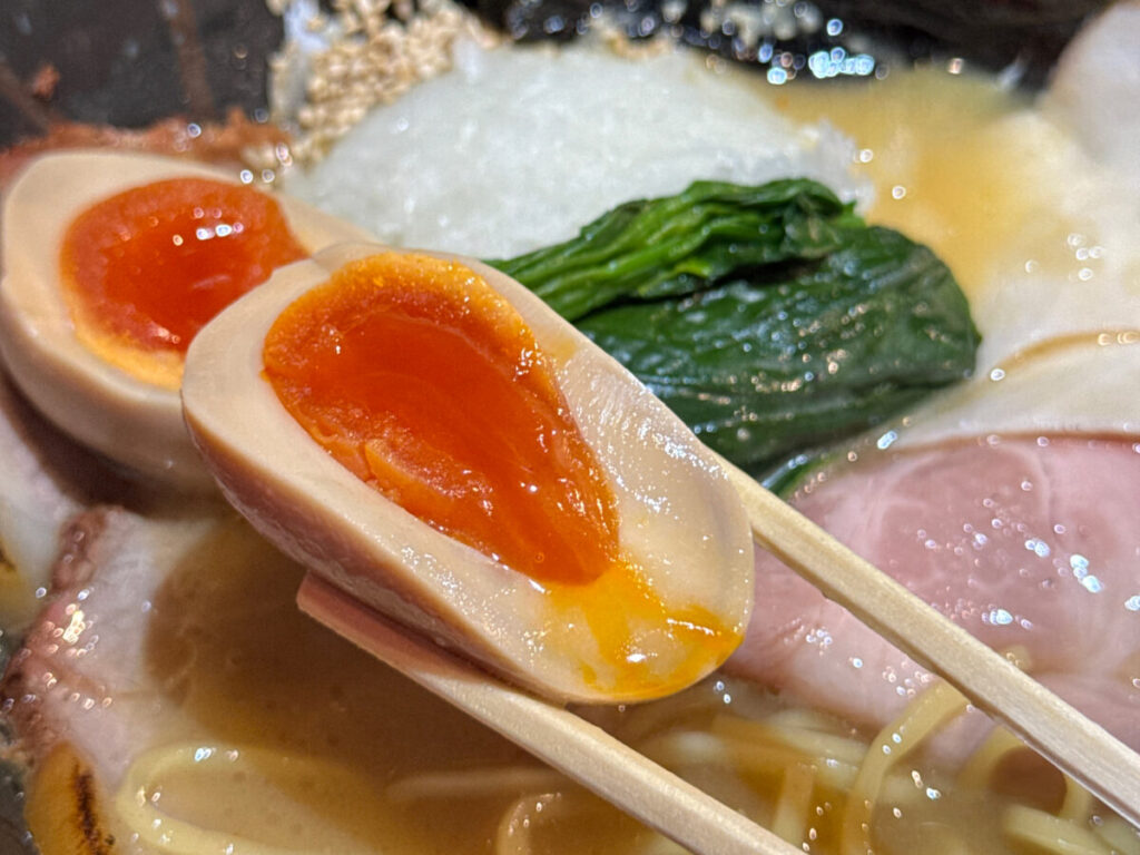 さてさて、お次は半熟卵へ!見てくださいよこのオレンジ!お箸で掴むととろっとろ具合がわかる!