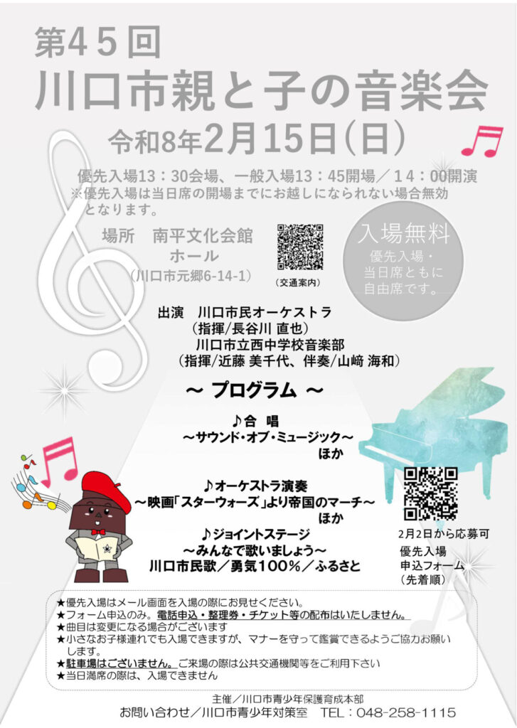 2月15日に南平文化会館ホールで「川口市 親と子の音楽会」が開催されるみたい。入場無料。