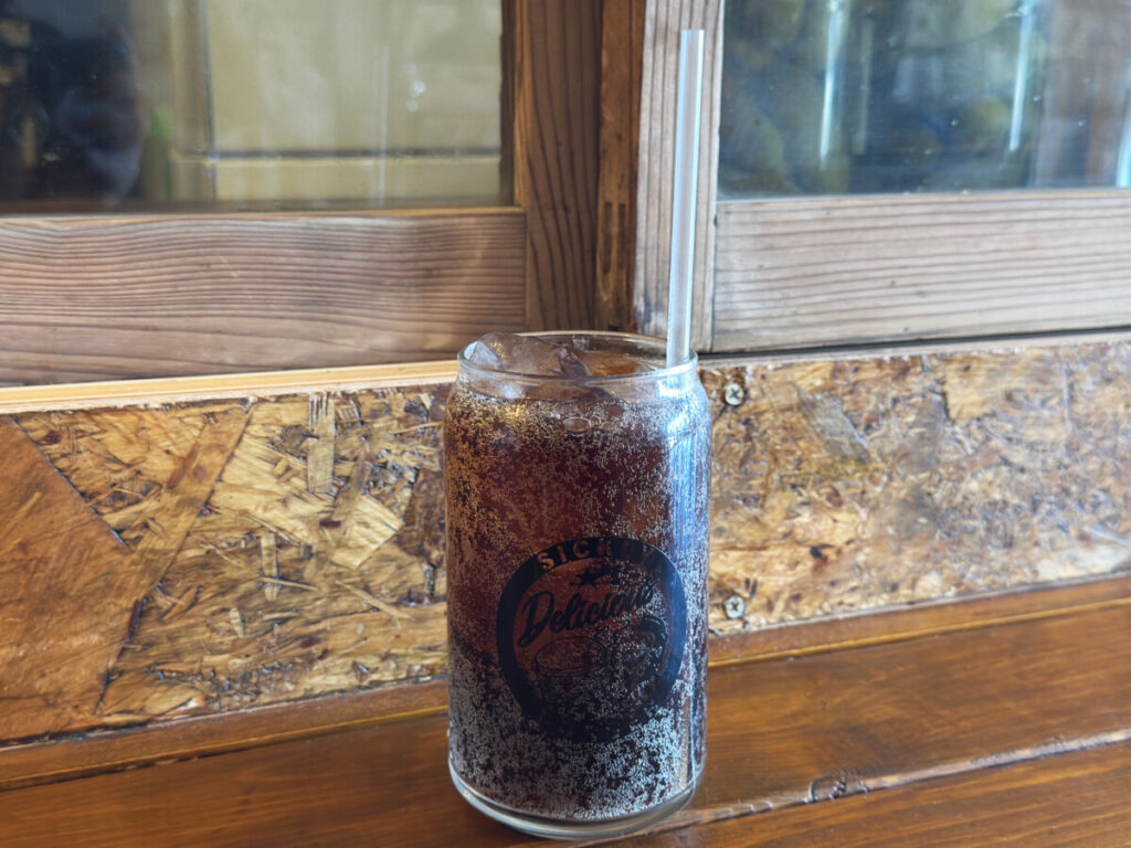 シックリーオリジナルグラスに、くっくっくっとコーラを注ぎまして、