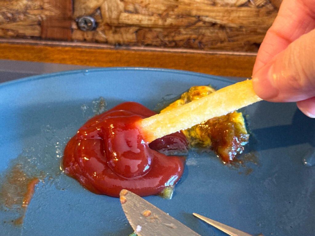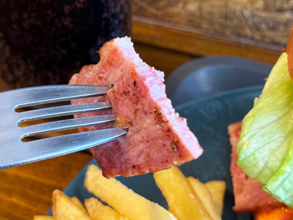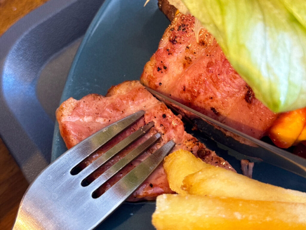 よ〜っし。まずは、はみ出しすぎているベーコンをいただこうじゃないのよ!