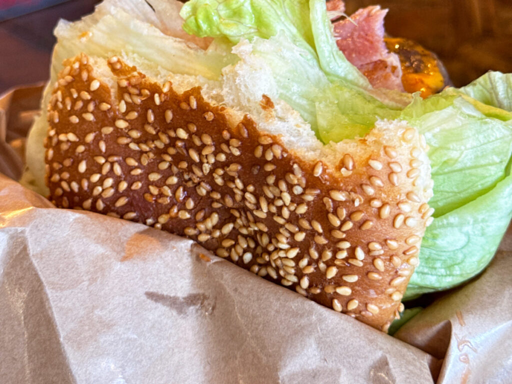 って、ちょっと待って。ゴマが乗っかったこのバンズ、こんがりと香ばしくてこれがまたいい!