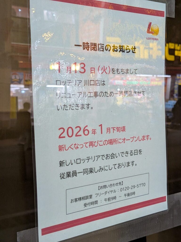 そのため、ロッテリアは1月13日をもって一時閉店とのこと。