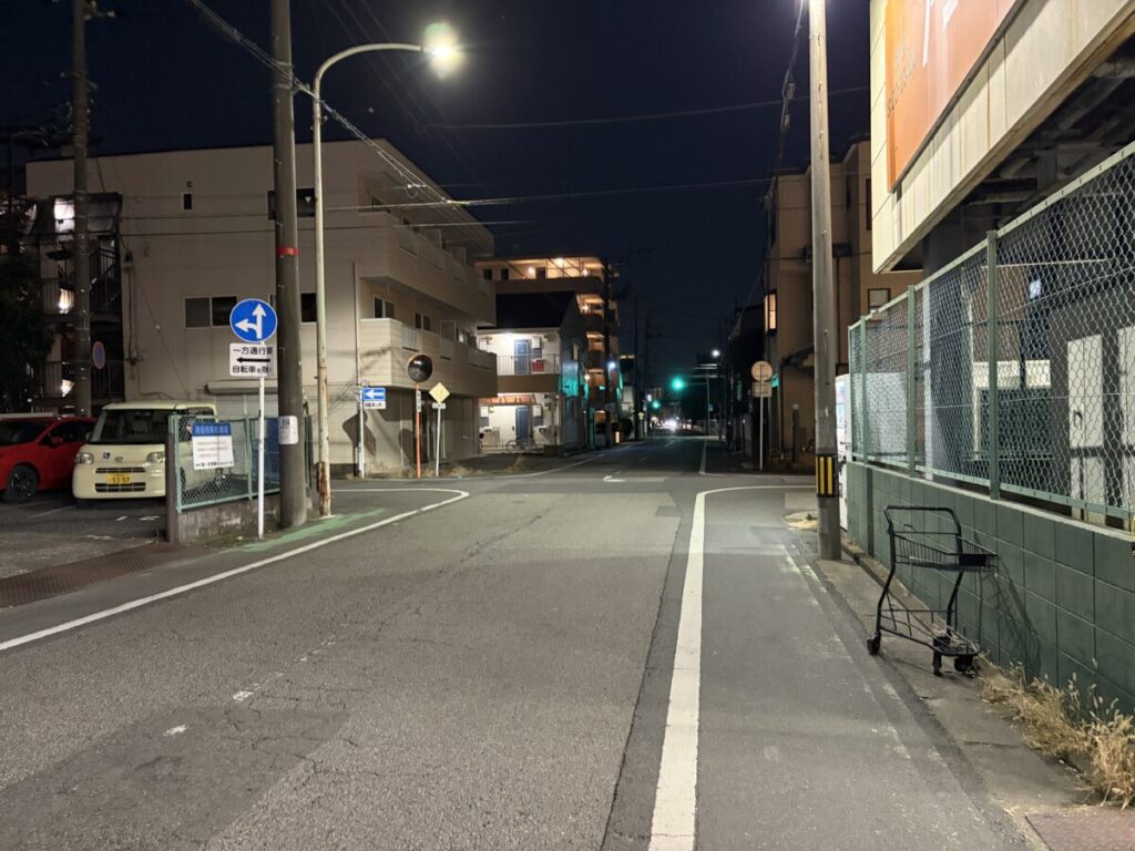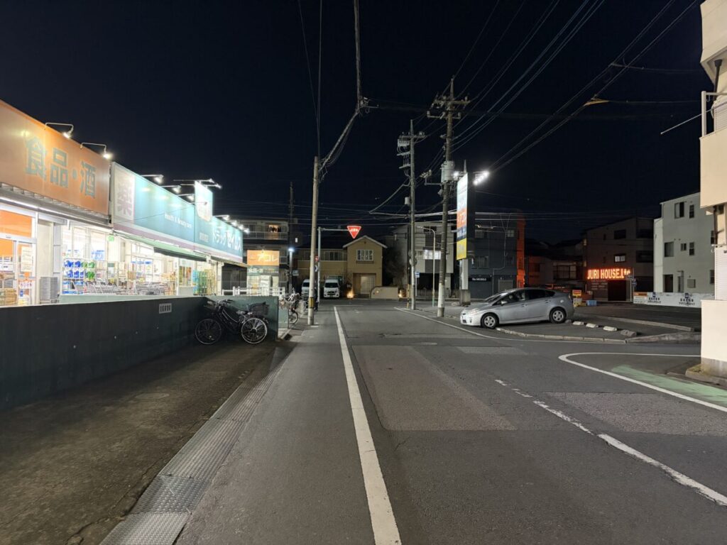 お店を背にして左はこんな感じ。お隣は「ドラッグセイムス」で、つきあたりを右にいくと、益子病院付近の産業道路にぶつかります。