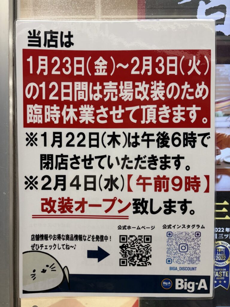 「ビッグ・エー」にリニューアルへむけて、1月23日(金)~2月3日(火)の12日間は売場改装のため休業。