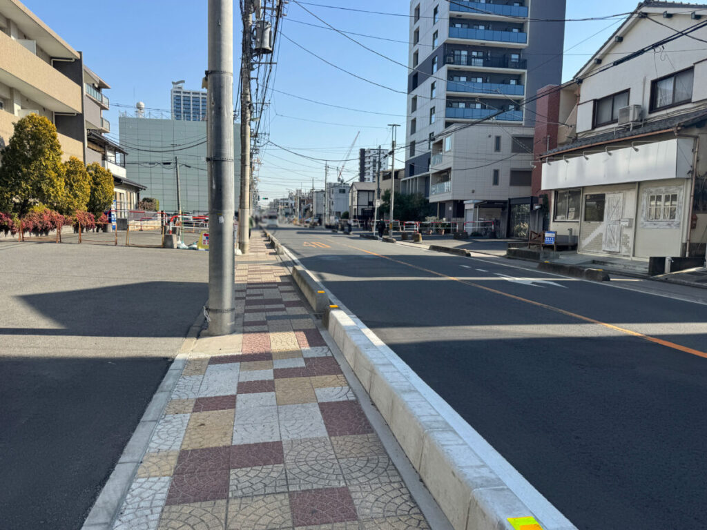 左は川口元郷駅方面。「ファミリーマート」や「昭和シェル」、「トレファクスタイル」などがあります。
