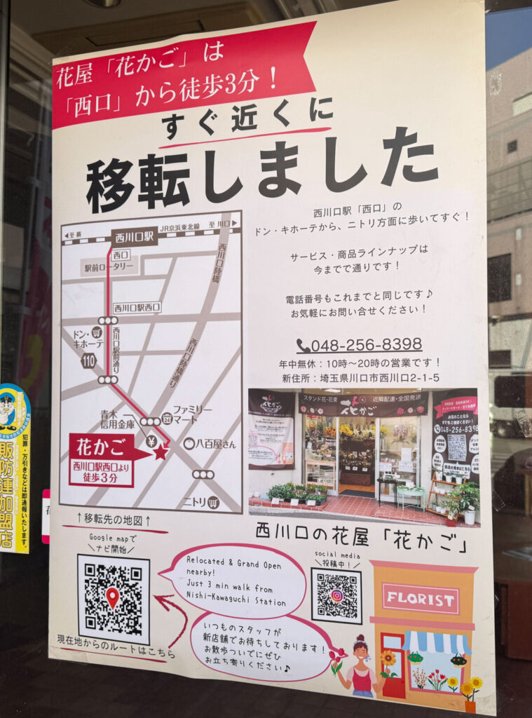 店頭に『花屋「花かご」は「西口」から徒歩3分!すぐ近くに移転しました』というポスターが出ていましたよ!