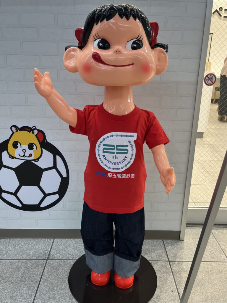 店頭では埼玉高速鉄道 開業25周年記念ロゴ入りTシャツを着たペコちゃん人形がお出迎え!