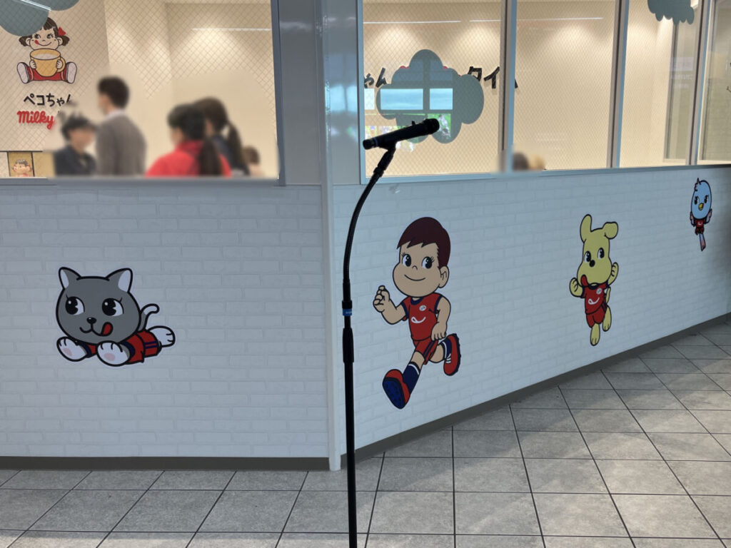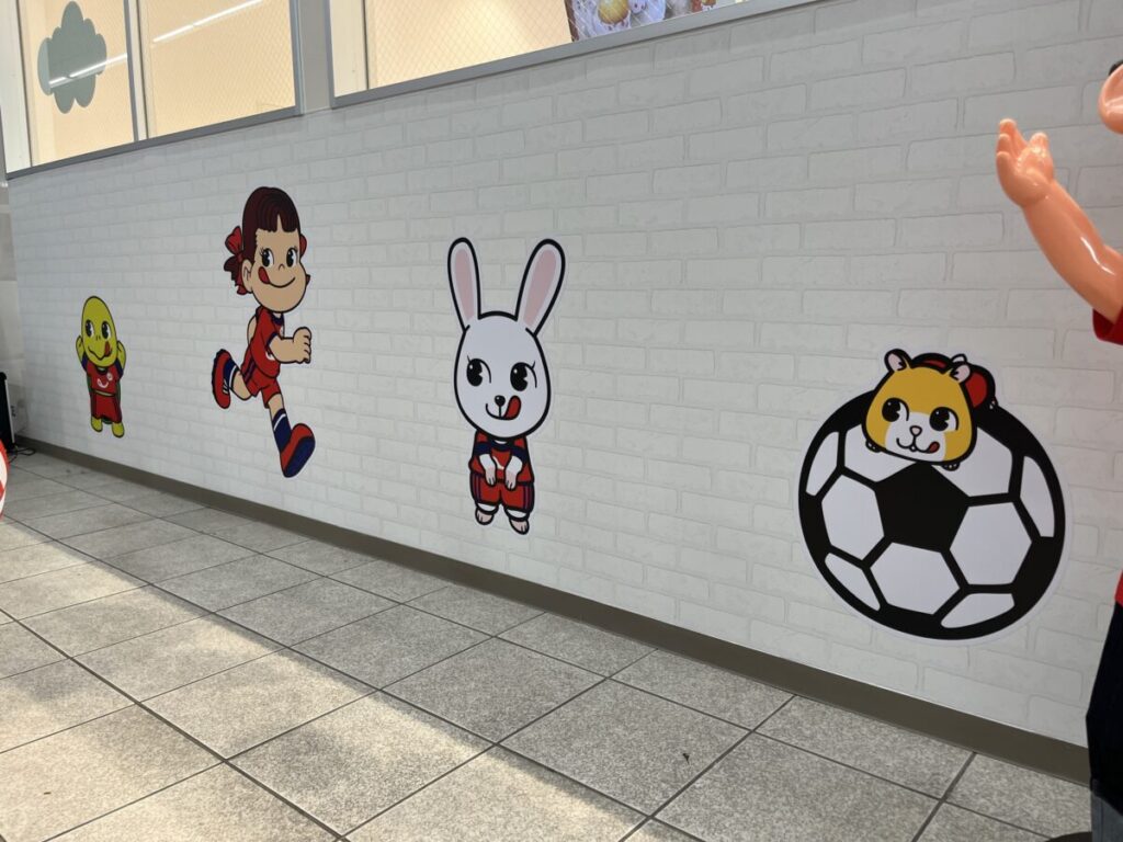 さらに外壁には、埼玉スタジアムのある浦和美園駅らしく、ユニフォームを着たペコちゃん、ポコちゃんとゆかいな仲間たち、そしてサッカーボールのイラストも!