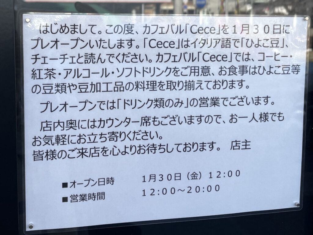 プレオープン初日の1月30日にお店に行ってみると、店頭に貼り紙が貼ってありましたよ。