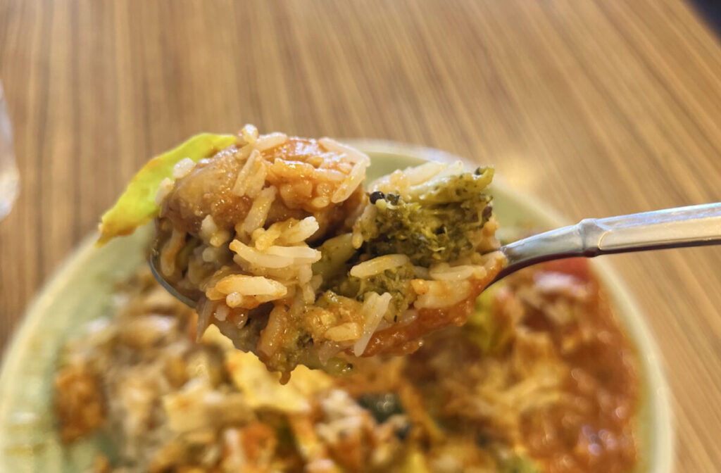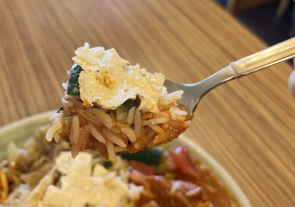 そして、上に乗っているこの”パリパリ”は、バスマティライスを混ぜ混ぜして食べるのがオススメなんだとか。