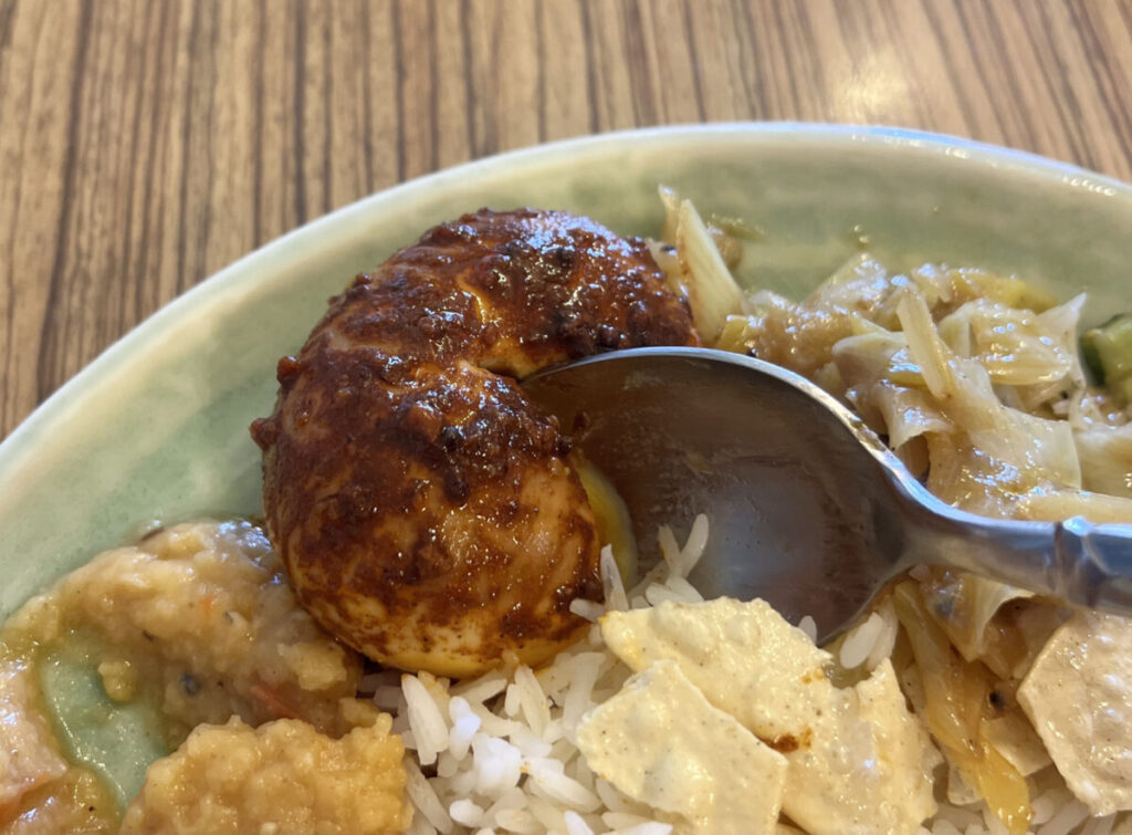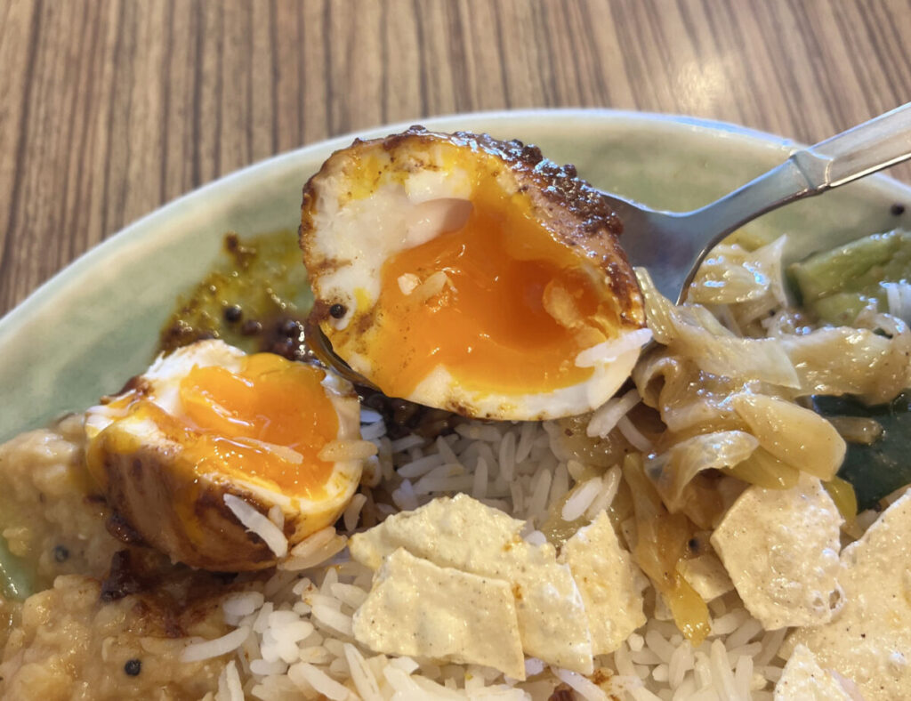 さらにさらに、大好きで追加トッピングしちゃった、たまごのアチャールを割ってみると・・・