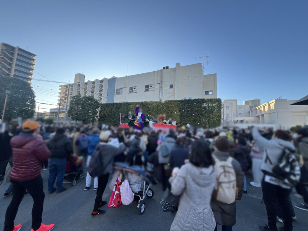川マガ編集員は写真を撮るため、かなり後ろの方にいたのですが、それでもお菓子が飛んできました!