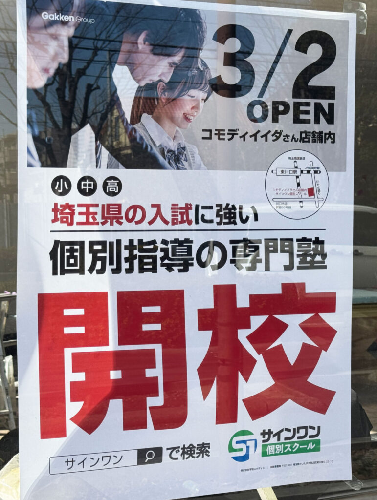 「コモディイイダ東川口店」に、進学塾『サインワン 東川口校』が3月2日(月)に新規開校するみたい。店頭にお知らせが出ていましたよ。
