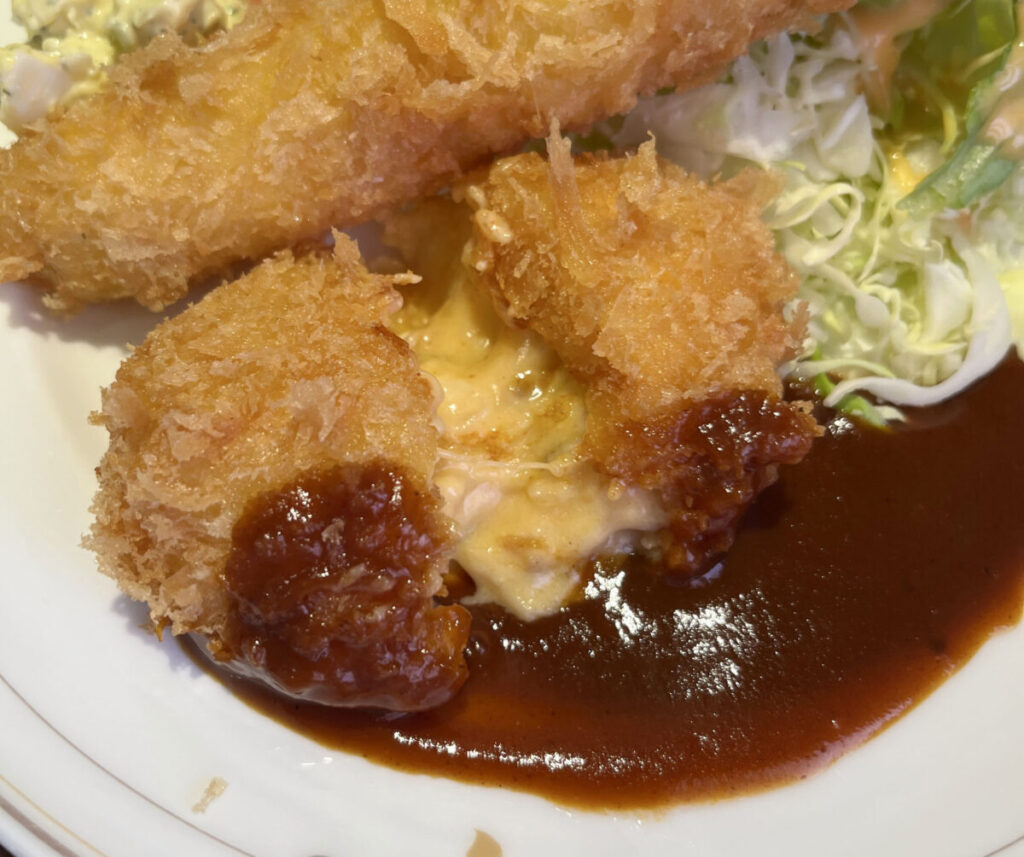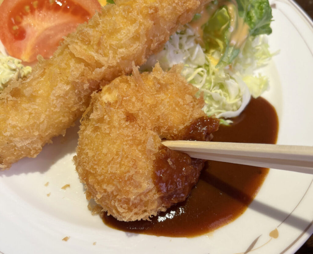 ここでまたカニクリームコロッケに戻りまして、今度はたっぷりソースを絡めていただくっ!