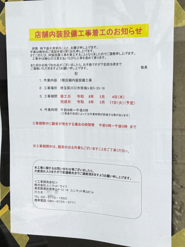 建物の窓には「店舗内装設備工事着工のお知らせ」と書かれた案内が掲示されていましたよ。