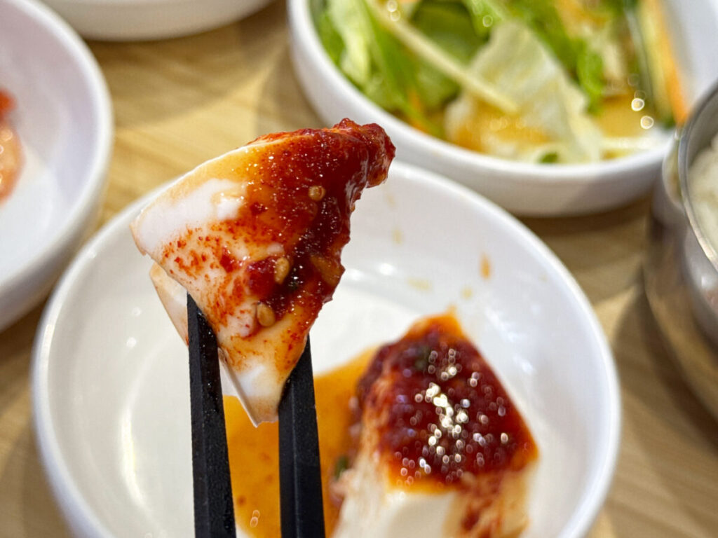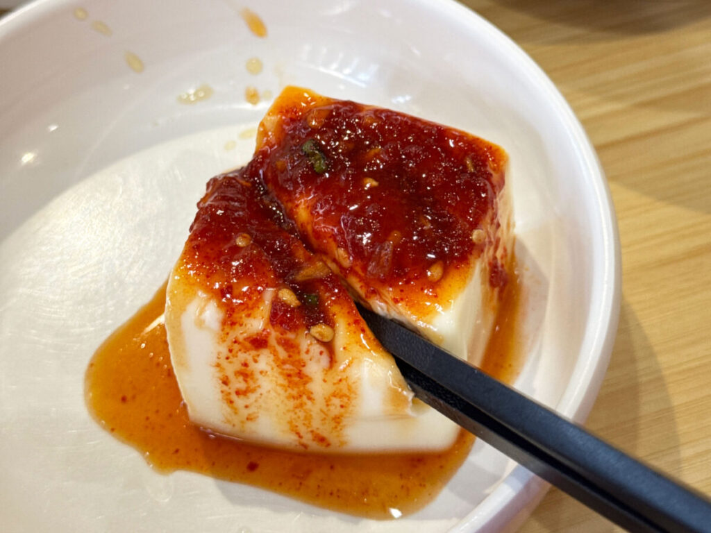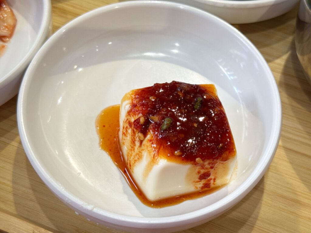 豆腐にはキムチのタレみたいなのがかかってて、これがまた食欲をそそるんだ。