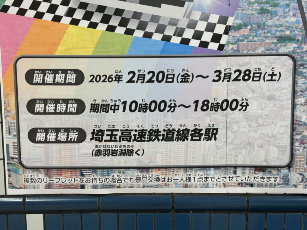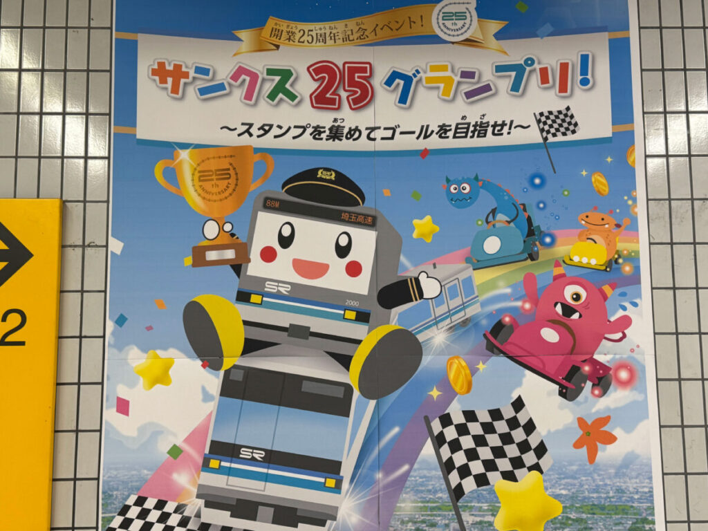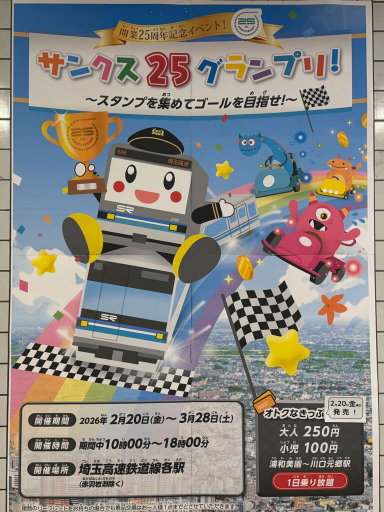 埼玉高速鉄道で「サンクス25グランプリ!〜スタンプ集めてゴールを目指せ!〜」が、2月20日(金)〜3月28日(土)に開催されるみたい!川口元郷駅にポスターが出ていましたよ!