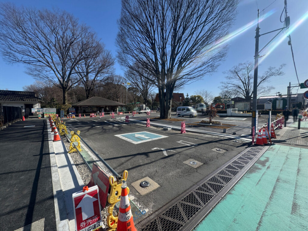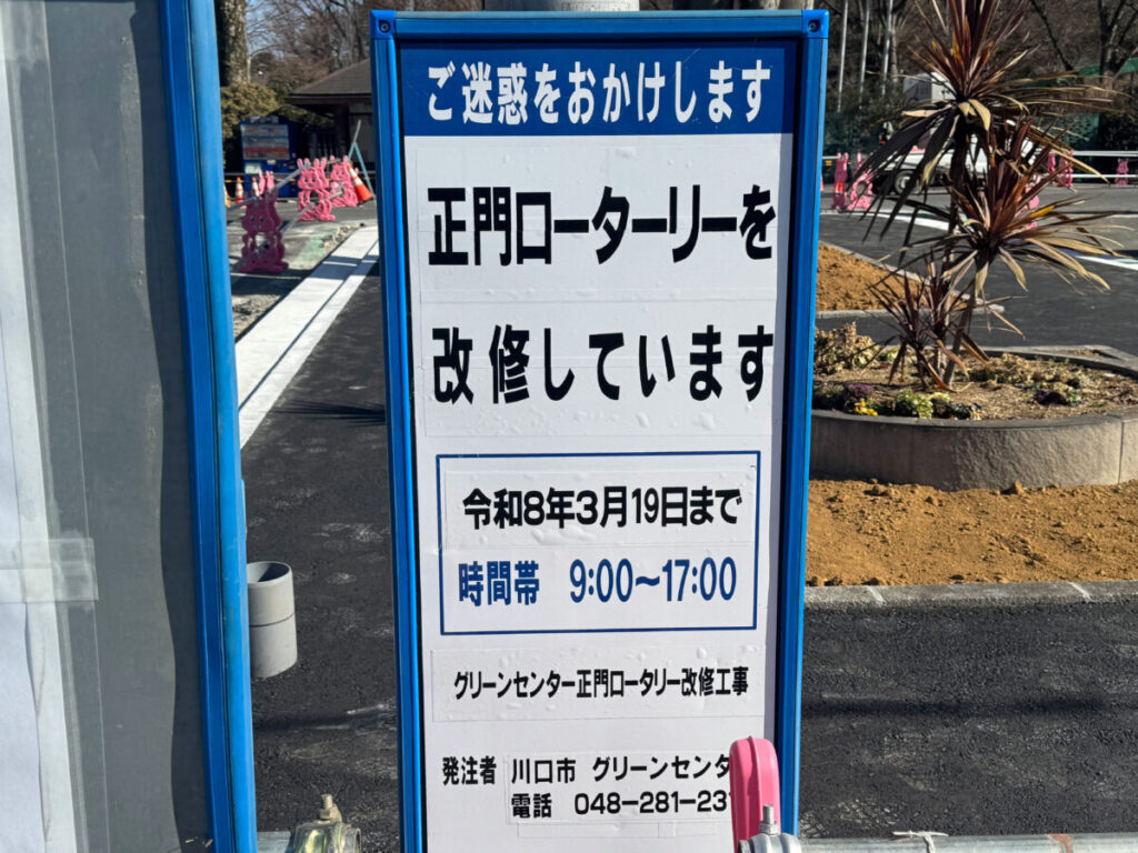 川口市立グリーンセンターの正面ロータリーが現在改修工事中。現地にお知らせが出ていましたよ。