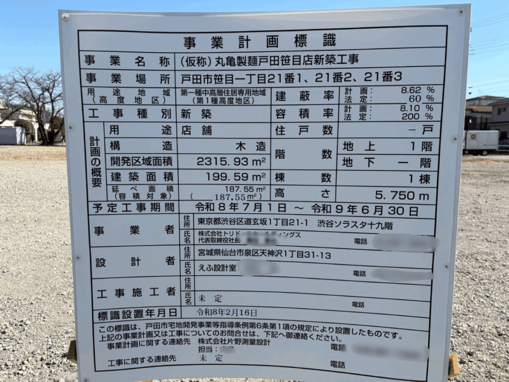 戸田市笹目に「丸亀製麺」ができるかも。『事業計画標識』が掲示されていましたよ。