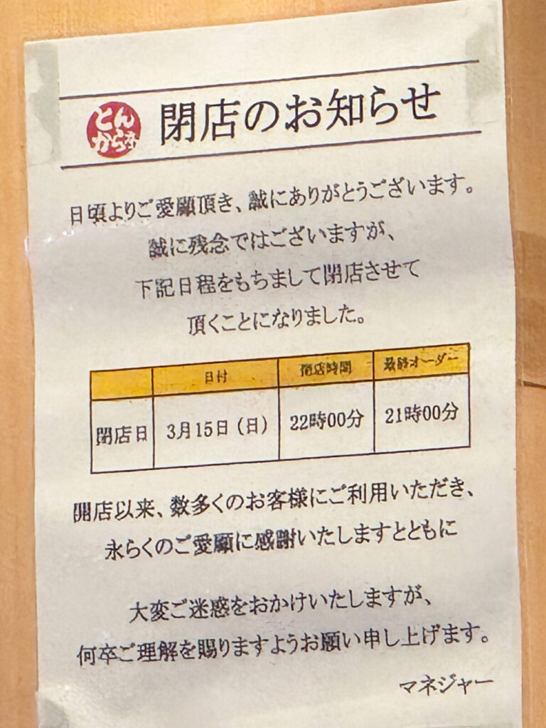 店頭にも閉店のお知らせが。「閉店日 3月15日(日) 閉店時間22時00分 最終オーダー21時00分」とのこと。