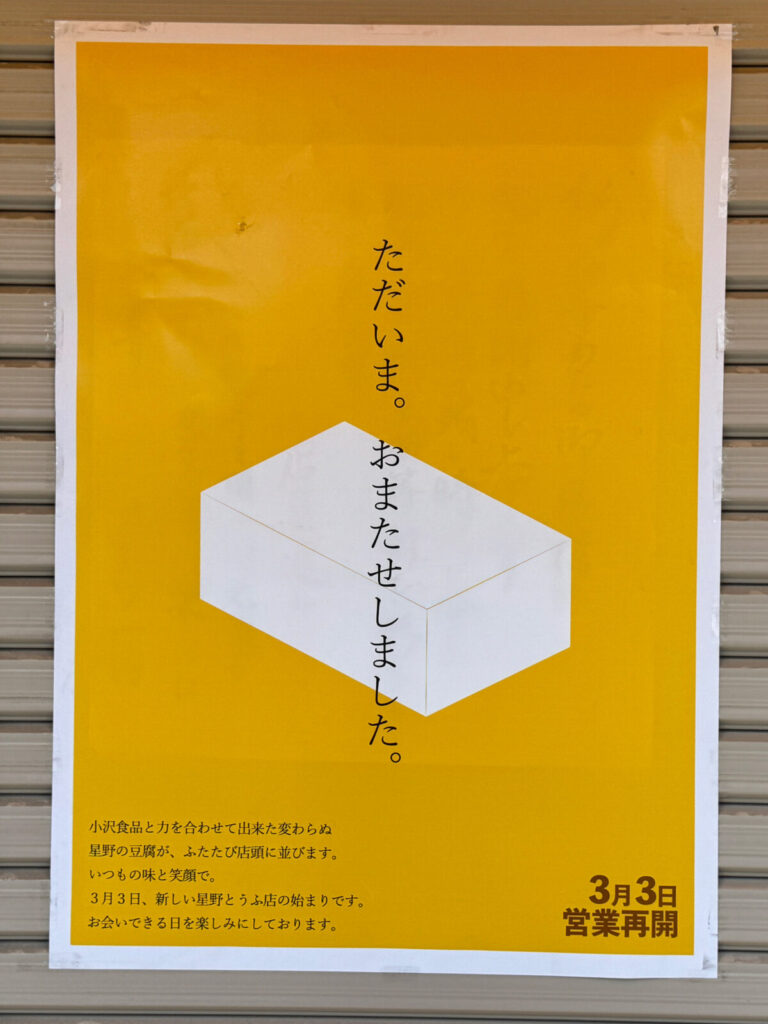 「小沢食品と力を合わせて出来た変わらぬ星野の豆腐が、ふたたび店頭に並びます。いつもの味と笑顔で。3月3日、新しい星野とうふ店の始まりです。お会いできる日を楽しみにしております。」