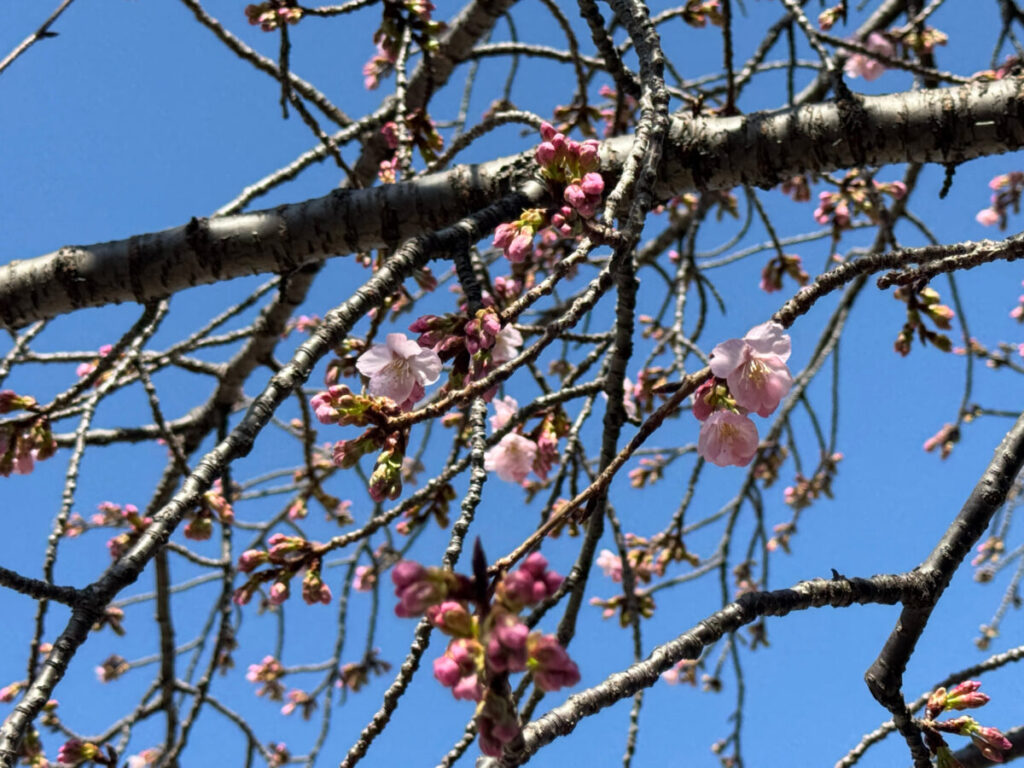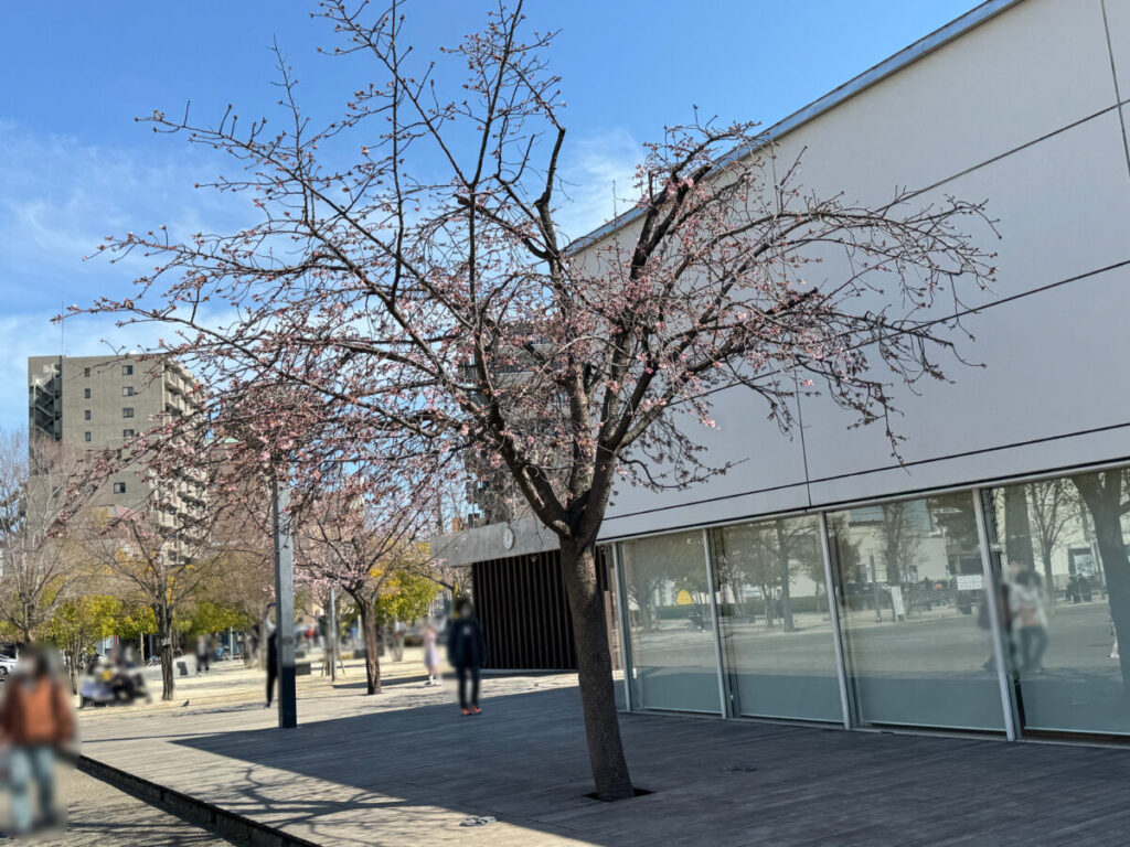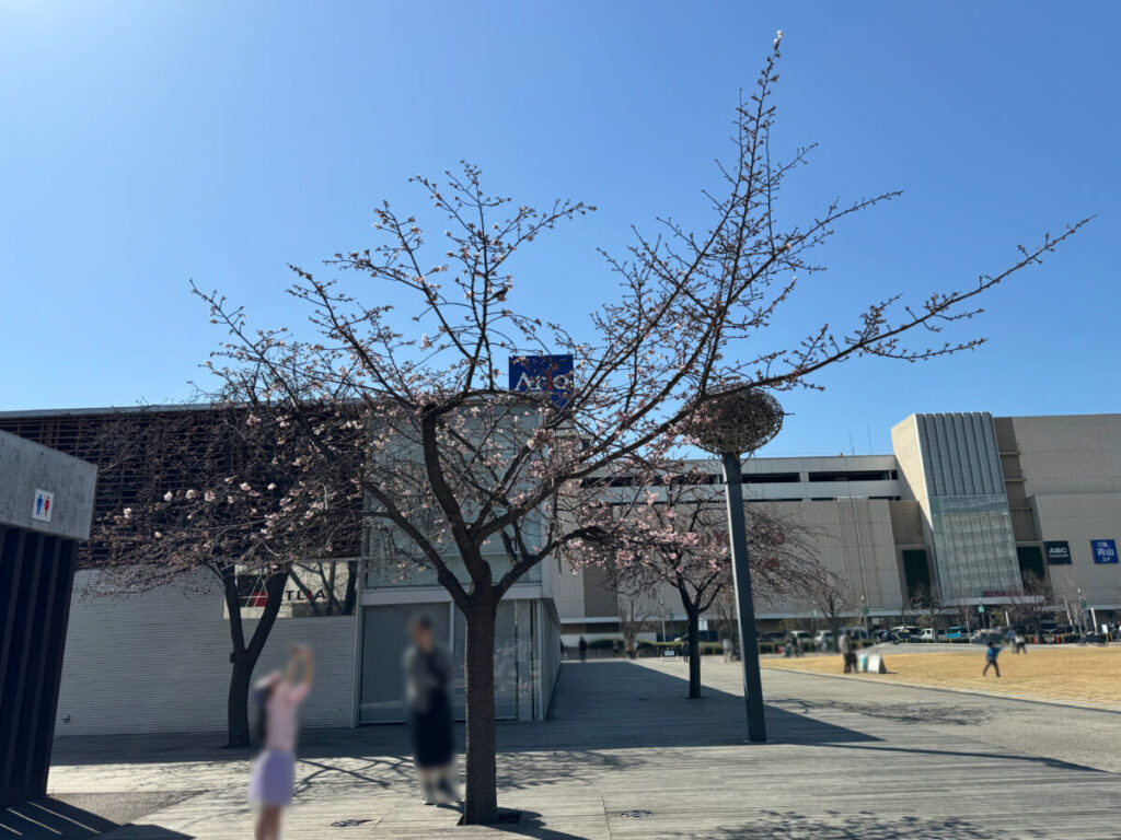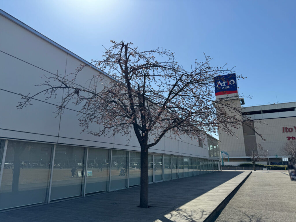 アリオ川口の前の安行桜が咲き始めていましたよ!2月28日の様子です。