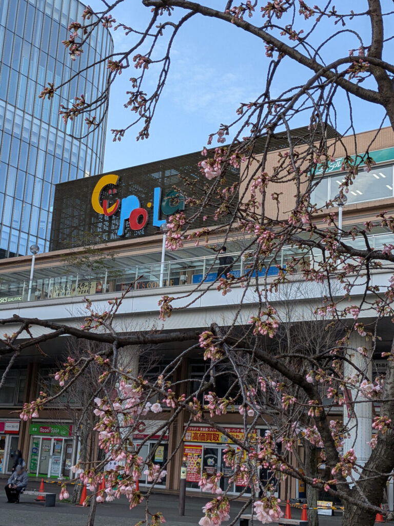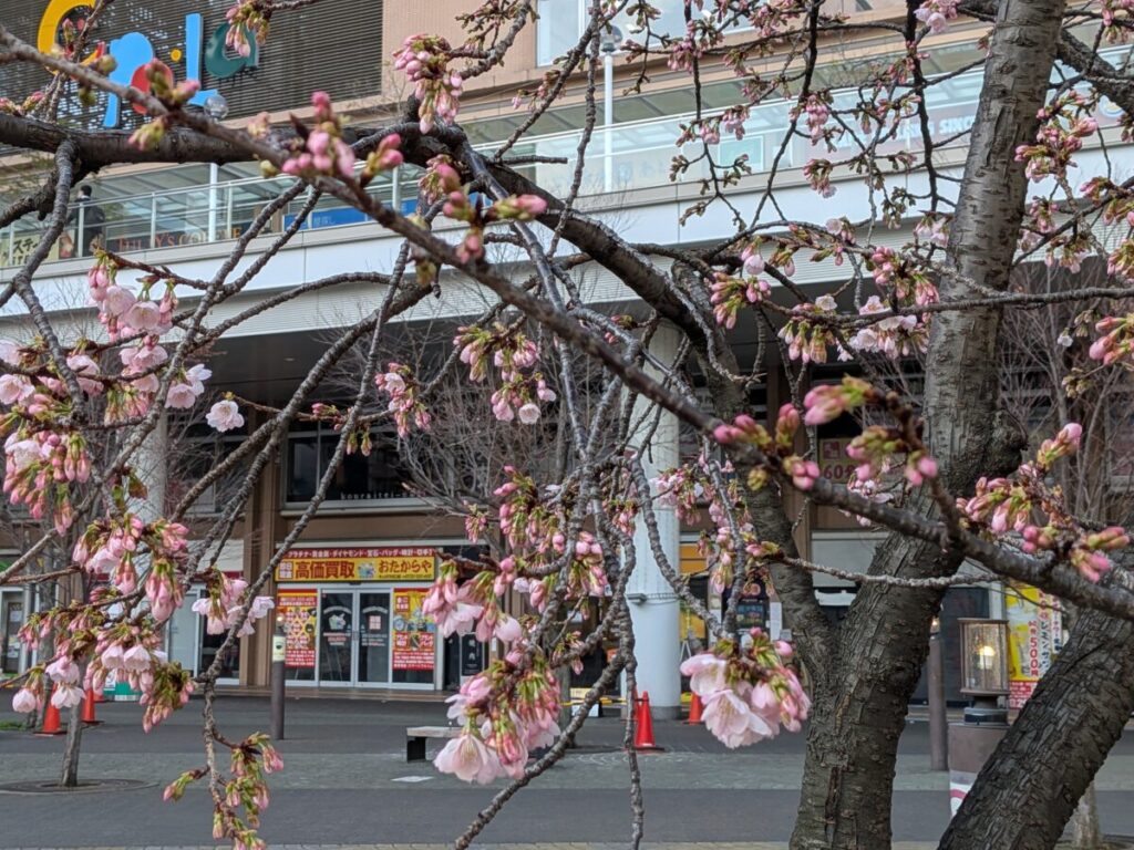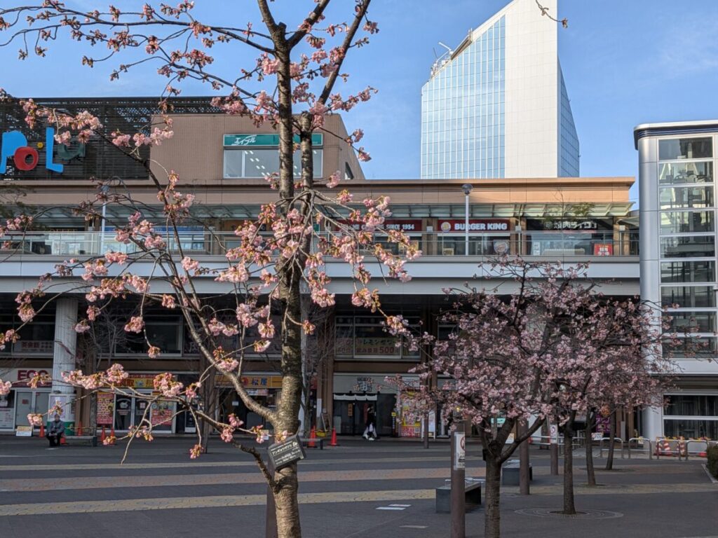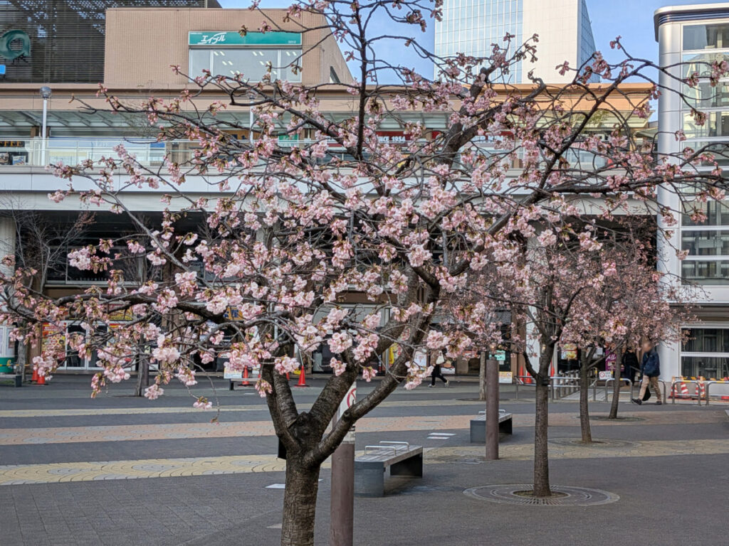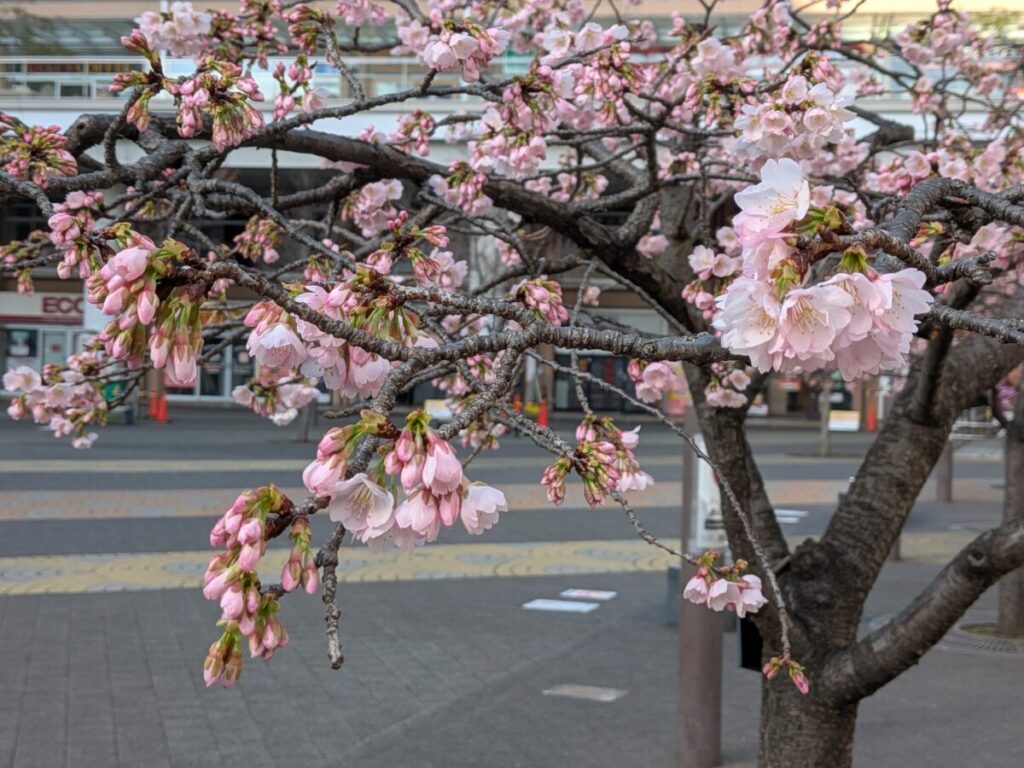 川口駅前のキュポ・ラ広場の安行桜の開花状況。