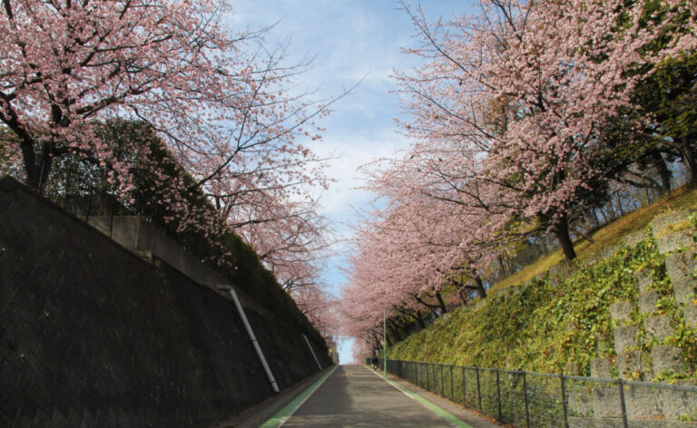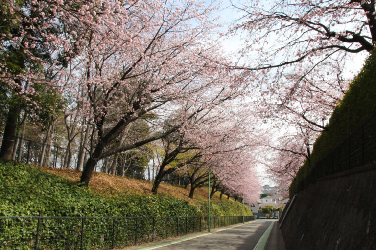 安行原自然の森と密蔵院駐車場間の坂道、満開の桜街道。