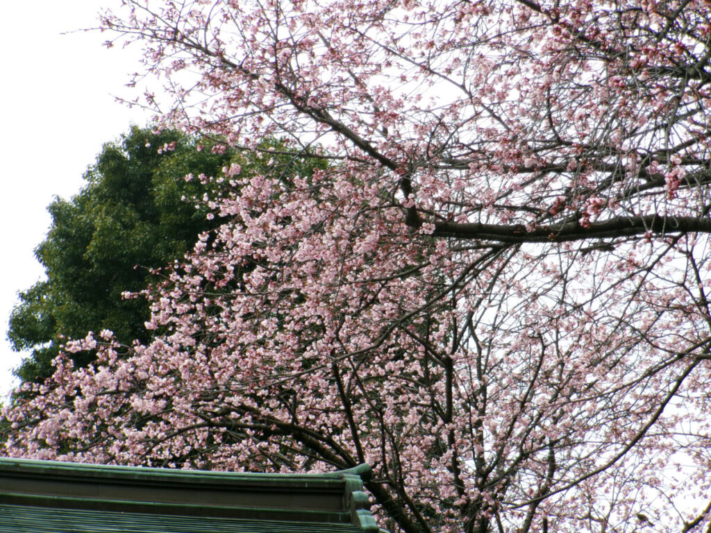 参道入口の、こっちのほうにも濃いピンクの桜が!